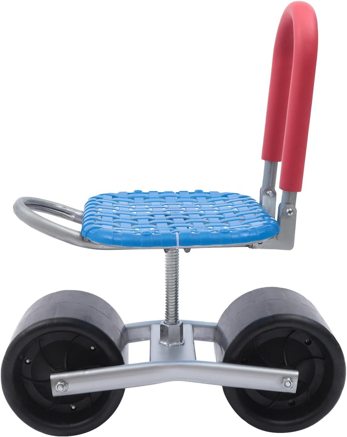 Make gardening and yard work easier on your body with this Rolling Garden Stool with Wheels. Designed for comfort and convenience, this portable garden scooter seat lets you tend to your plants, pull weeds, and tackle low-level tasks without constantly bending down or kneeling on hard ground. The 360-degree swivel feature allows you to rotate freely in any direction, so you can move smoothly along garden beds without ever having to stand up. Built to support up to330 lbs, this sturdy rolling stool is suitable for a wide range of users. The wheeled base glides effortlessly across patios, garden paths, and garage floors, making it a versatile companion for both indoor and outdoor tasks. Whether you are working in the garden, doing light repairs in the garage, or tackling any seated task close to the ground, this rolling garden stool keeps you comfortable and mobile. Its compact and portable design means you can easily move it from one area to another as needed. A practical and thoughtful addition to any gardener's toolkit, this rolling stool helps reduce strain and fatigue so you can focus on what you love most — your garden. SpecificationsMaterial of Frame: High-carbon SteelMaterial of Seat: PPMaterial of Wheel: PE Material of Handle: SpongeProcess: GalvanizationColor: Blue+Black+RedStyle: ModernShape: L-ShapedAssembly Required: YesMount Type: Floor StandingRotation: 360°Bearing Capacity: 150kg/330.69lbsNumber of Wheels: 3Net Weight: 2.8kg/6.17lbsGross Weight: 3.3kg/7.28lbsWheel Diameter: 16.8cm/6.61inchOverall Size: 43*32cm/17*12.6inchAdjustable Height Range: 23-38cm/9.06-14.96inchSize of Seat: 31*24cm/12.2*9.5inchPackage Size: 39*31*23.5cm/15.35*12.2*9.25inch