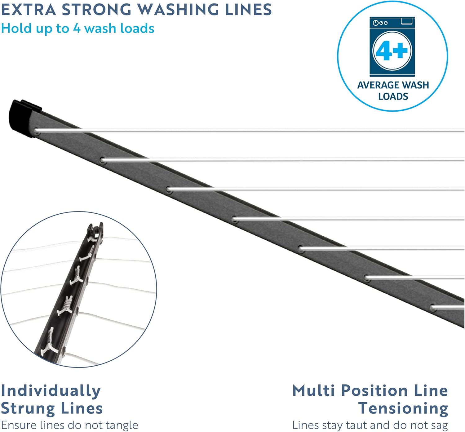 The Minky Multi-Height RotaLift 60m 4Arm airer has been ergonomically designed for easy and convenient laundry drying and is ideal for larger gardens and families. The airer opens easily with a smooth lightweight pulley system and the arms can be lowered or raised to your desired loading height with a simple and safe adjustment mechanism. With a premium quality, heavy duty finish the Minky Rotalift airer has the ultimate weather resistance. The robust wide diameter aluminium central pole will not rust and the deep, extra strong arms are both galvanised and graphite coated. The airer fully rotates so you can stay in one position whilst loading the airer, making the process super quick and easy. It also features individually strung lines that stay taut and do not sag or tangle in use - ensuring that the airer can handle the heaviest of washing loads. The airer comes complete with a sleek and stylish cover to keep it clean between uses and a metal soil spike and ground socket for secure installation anywhere in your garden. The Minky Rotalift 60 metre 4 arm rotary airer has a turning circle of 310cms and holds 4+ wash loads - perfect for a large family.