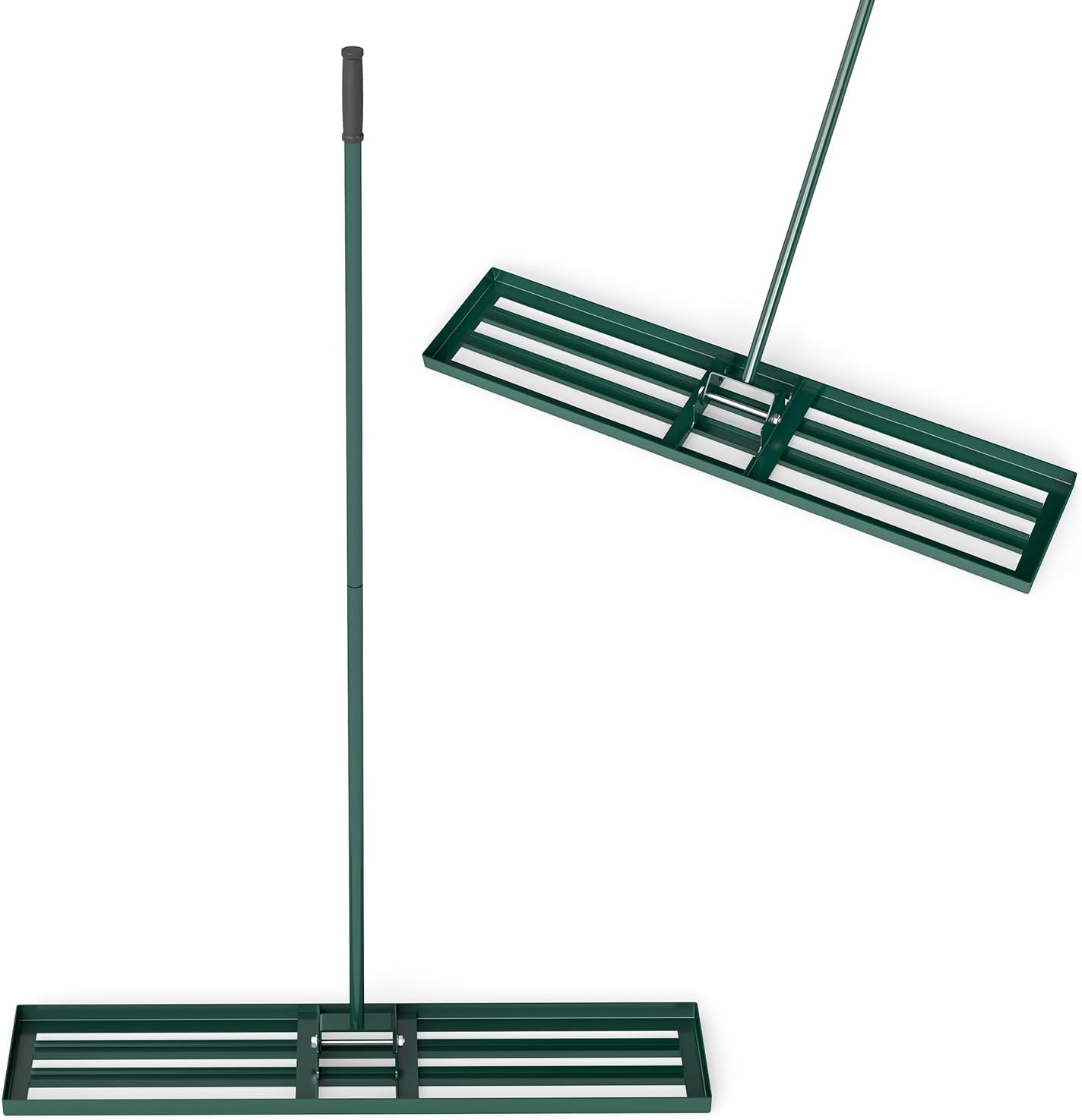 Are you looking for an efficient landscaping tool to tackle a variety of tasks with ease? Our lawn leveling rake is designed to meet all your needs with its large-sized flat rake, measuring up to 46” x 10”, making it perfect for leveling and spreading materials like sand, soil, compost, and grass on different surfaces. Besides, constructed from high-quality powder-coated metal, this tool is rustproof and anti-deform, ensuring long-term use. Moreover, the 67” anti-slip handle provides a firm and comfortable grip, while the flat head design and flexibly rotatable U-shaped head enhance maneuverability and speed up the leveling process. Whether you’re working on backyard landscaping, farms, sports fields, or golf courses, this tool will upgrade your landscaping experience! Features: Treated with powder on the surface for long-term use The tight screw connection ensures extra stability during use Large head for efficient leveling on various surfaces Reinforced head-to-pole connection withstands intense use Anti-slip handle reduces strain during extended use Easy disassembly for convenient storage, saving space when not in use Quick and easy installation to save your time and energy Specifications: Color: Green, Black, Silver Material: Metal, PVC Plate Dimension: 46” x 10” Handle Length: 67” Net Weight: 15 lbs Package includes: 1 x Lawn Leveling Rake 1 x InstructionWhy You Choose Our Lawn Leveling Rake? √ U-shaped bracket with double point welding is sturdy √ Versatile for different settings, such as garden, farm or golf course