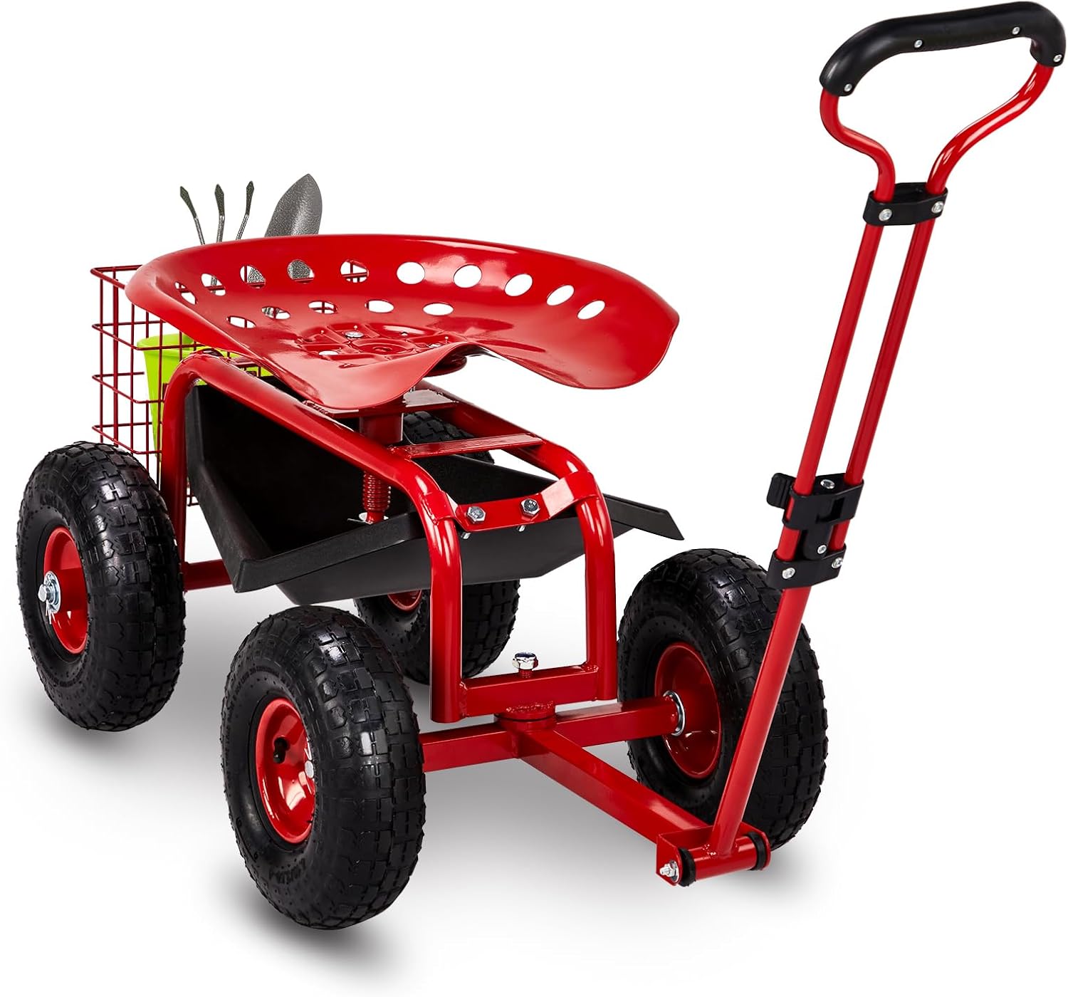 This rolling garden cart features a sturdy steel frame, a 360° rotatable seat, and height-adjustable handle. Equipped with inflatable antiskid tires and ample storage space, it is lightweight, easy to move, and senior-friendly. Perfect for lawn, backyard, patio and outdoor gardening tasks.Product SizeMetal Basket: 9.65"×4.53"×8.07"(LxWxH)wheel Size: 10"Overall Dimension: 37.01"×16.93"×18.9"-20.87" (LxWxH)Adjustable Height: 18.9"-20.87"Bearing: 330 LBSNet weight: 28.2 LBSPackage Dimensions: 23.6" × 15.7" × 14.6"Package Weight: 32.30 lbsPackage Includes:Garden cart × 1Accessory kit × 1Instruction manual × 1
