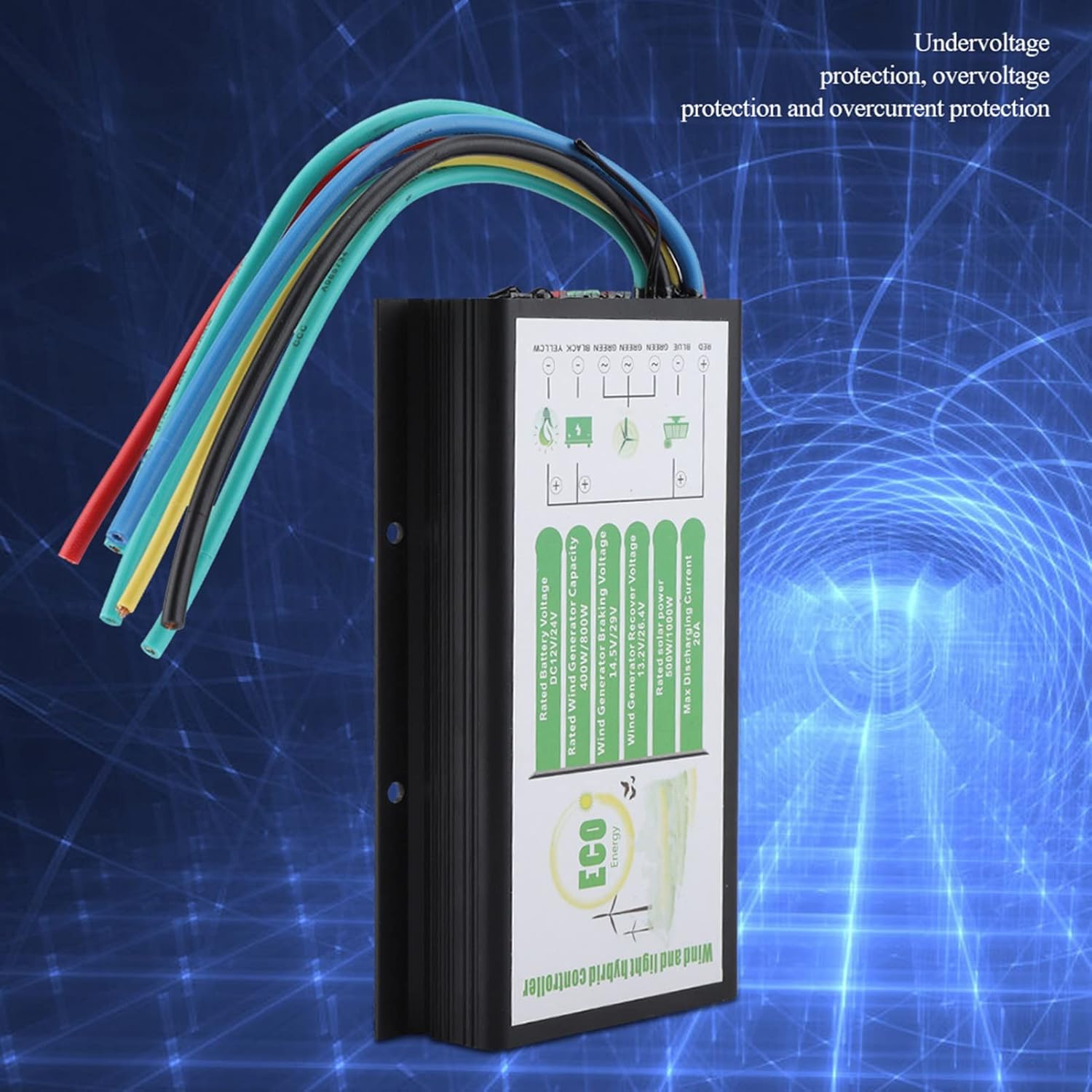 The solar charging uses a series charging control method to increase the charging efficiency by 3%-6%. At the same time, the controller MCT charging function tracks the maximum current of the solar panel in real time, and the charging method is more efficient.Features: 1. With protection.2. With temperature compensation.3. Power devices for reliable performance and long life.4. Undervoltage protection, overvoltage protection and overcurrent protection.5. Battery reverse connection, solar panel reverse connection, battery reverse discharge protection.6. The fully sealed and completely design makes the controller's stability and reliability greatly improved.7. The all-aluminum casing and the multi-edge bottom plate design increase the heat dissipation area, so that the entire controller is in an optimal heat dissipation state for a long time.8. The reverse connection protection of the wind turbine battery adopts a unique circuit design, which removes the traditional reverse-connected , which greatly improves the reliability and practicability of the whole system.Specification: Condition: 100% Brand NewItem Type: Wind and Solar Hybrid ControllerColor: Black Size: Approx. 13 * 8.2 * 2cm / 5.1 * 3.2 * 0.8inWeight: Approx. 384g / 13.5ozSelf Power Consumption:The Static Average Power Consumption : Approx. 13mA.During Charging And Discharging : Average 15 mAMaximum Discharge Current: 20AWorking Environment Temperature: -35-75 °CCharging Mode: MGT Mode ( Tracking Maximum Current)Package list: 1 * Wind and Solar Hybrid ControllerWiring:1. First connect the positive pole of the load, battery and solar panel to the red line of the controller.2. Reconnect the negative pole of the load.3. Then connect the negative pole of the battery to the negative pole of the battery of the controller. At this time, the