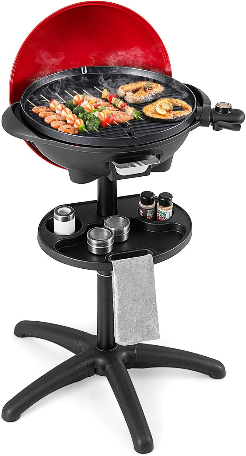 Product Description:Grill your favorite meals anywhere with this versatile 2-in-1 electric BBQ grill, perfect for both indoor and outdoor use. Powered by 1200W, it heats up quickly and evenly across a 200 sq.in double-zone cooking surface, ideal for 4–6 people at once or more with batch grilling. The removable stand lets you switch between freestanding patio grilling and countertop convenience with ease.Easily adjust the temperature from 356°F to 518°F with the control knob, while the built-in lid thermometer ensures precise cooking. The 3-layer grill plate—made of die-cast aluminum with a wear-resistant and BPA-free ceramic nonstick coating—delivers excellent heat retention and easy cleanup. With user-friendly features like cool-touch handles, a lid holder, condiment shelf, and a stable 5-point base, this grill makes everyday BBQ simple, safe, and enjoyable.Key Features:1200W fast, even heating200 sq.in double-zone grill surface for 4–6 peopleAdjustable temperature from 356°F to 518°FBuilt-in lid thermometer for easy monitoringRemovable stand for outdoor or countertop useCool-touch handles for safe operationBPA-free ceramic nonstick coatingDishwasher-safe grill plate and grease trayLid holder and lower shelf for convenienceStable 5-point base with locking buckleQuick and easy assemblySpecifications:Color: RedMaterial: Metal, AluminumDimensions: 25'' Dia x 40'' HGrill Plate Diameter: 16''Net Weight: 14 lbsVoltage: 120V / 60HzPower: 1200WCooking Area: 200 sq.inTemperature Range: 356°F–518°FPackage Includes:1 x Electric BBQ Grill1 x Instruction Manual