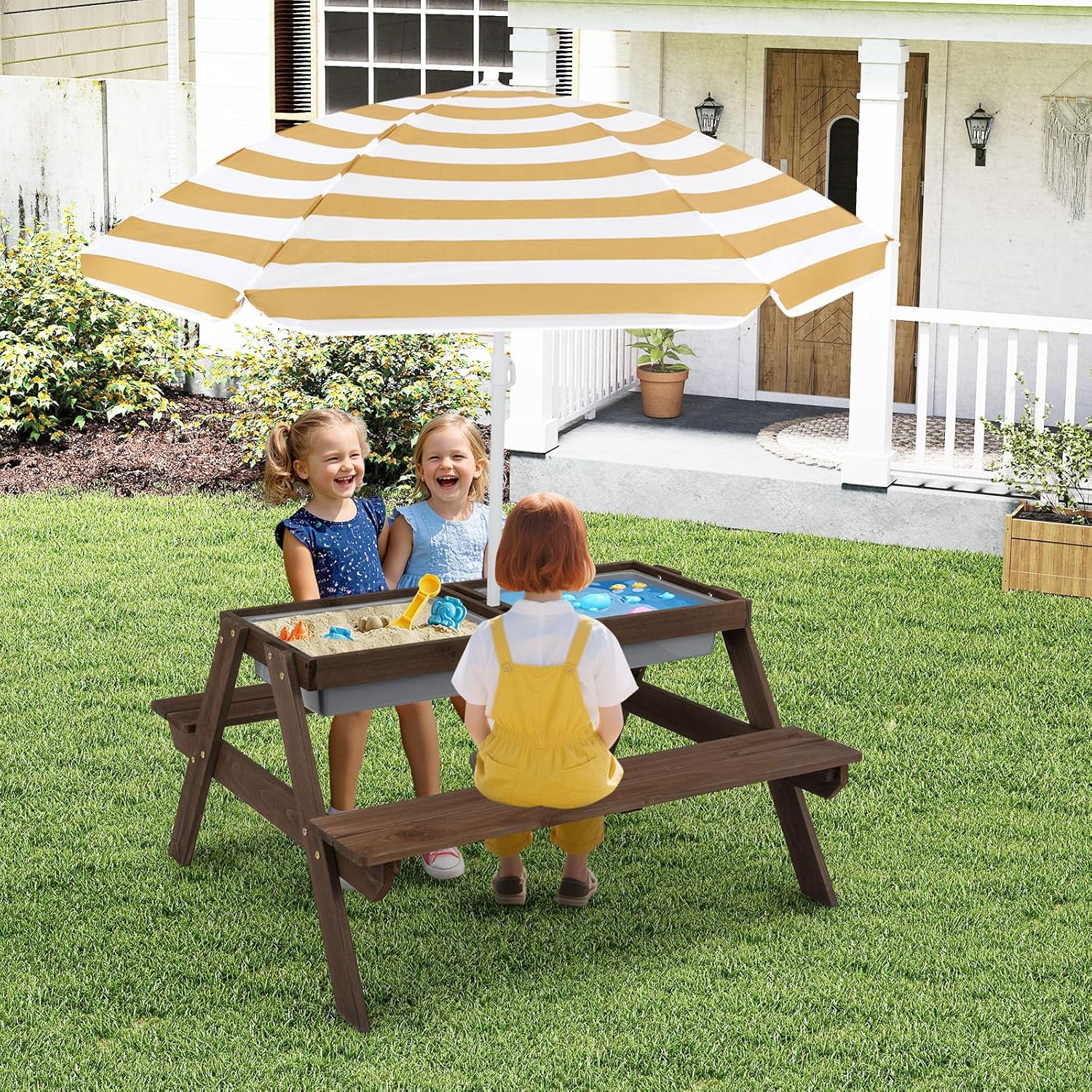 The 3-in-1 kids outdoor table and chairs can be served as water and sand table! The foldable umbrella is removable to bring indoors or to store away. When playtime fun is done, clean-up is easy with the two plastic boxes. Built with solid fir wood, this childrens picnic table will seat up to 4 children, ideal for play room, patio, garden or poolside. This stylish wooden outdoor kids table would be a great gift for boys and girls on birthdays, holidays.