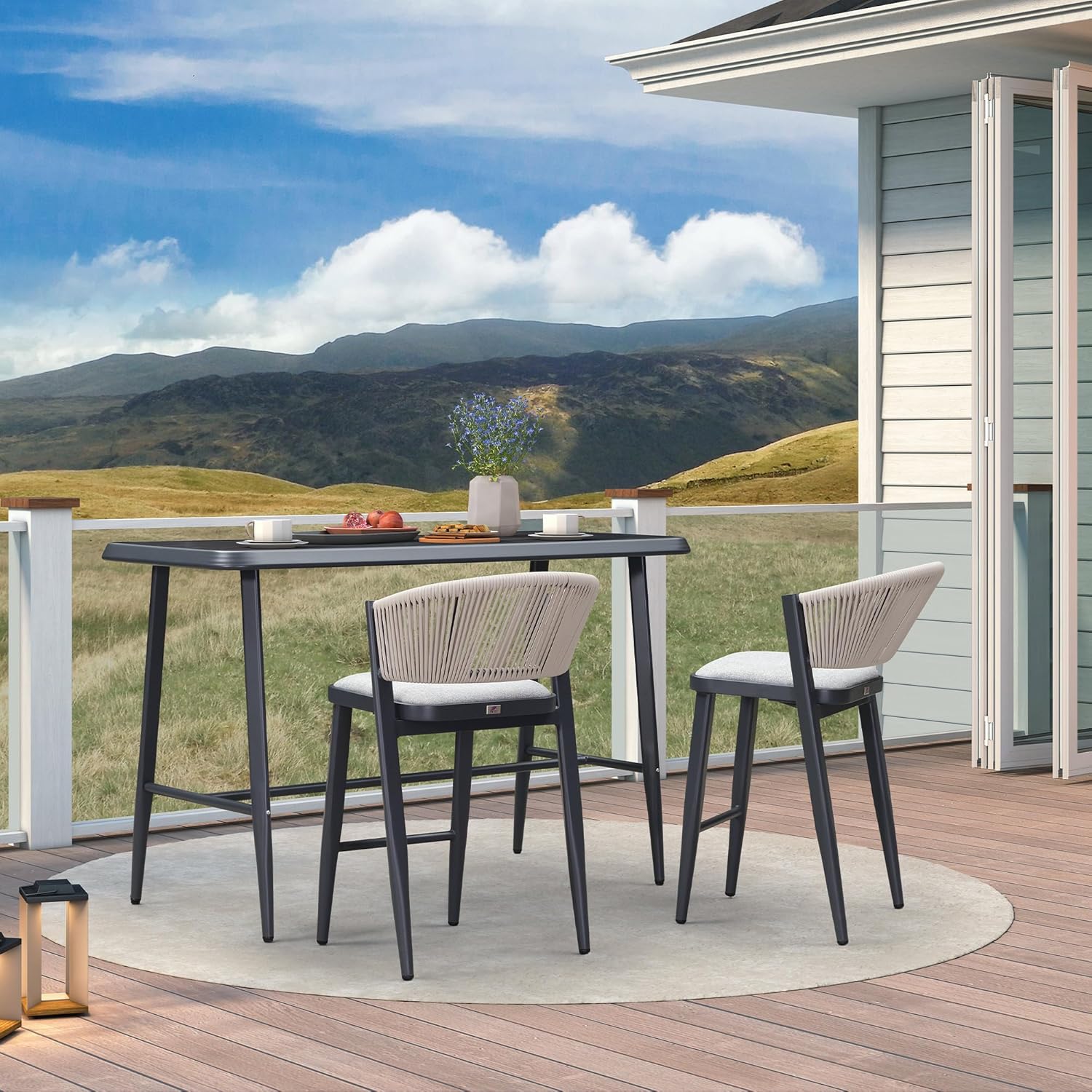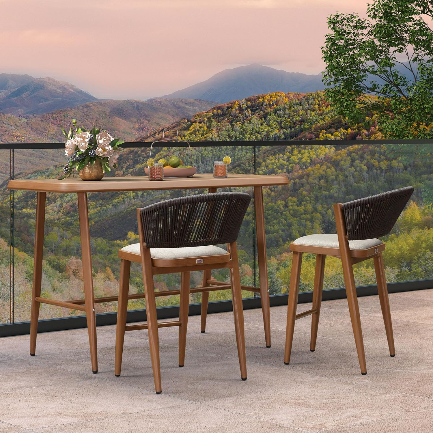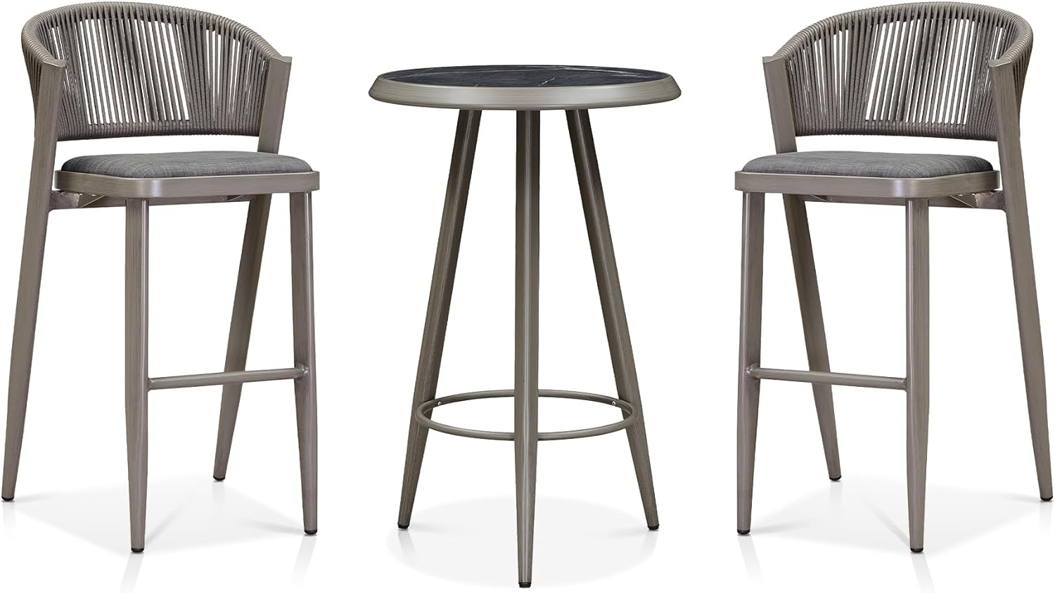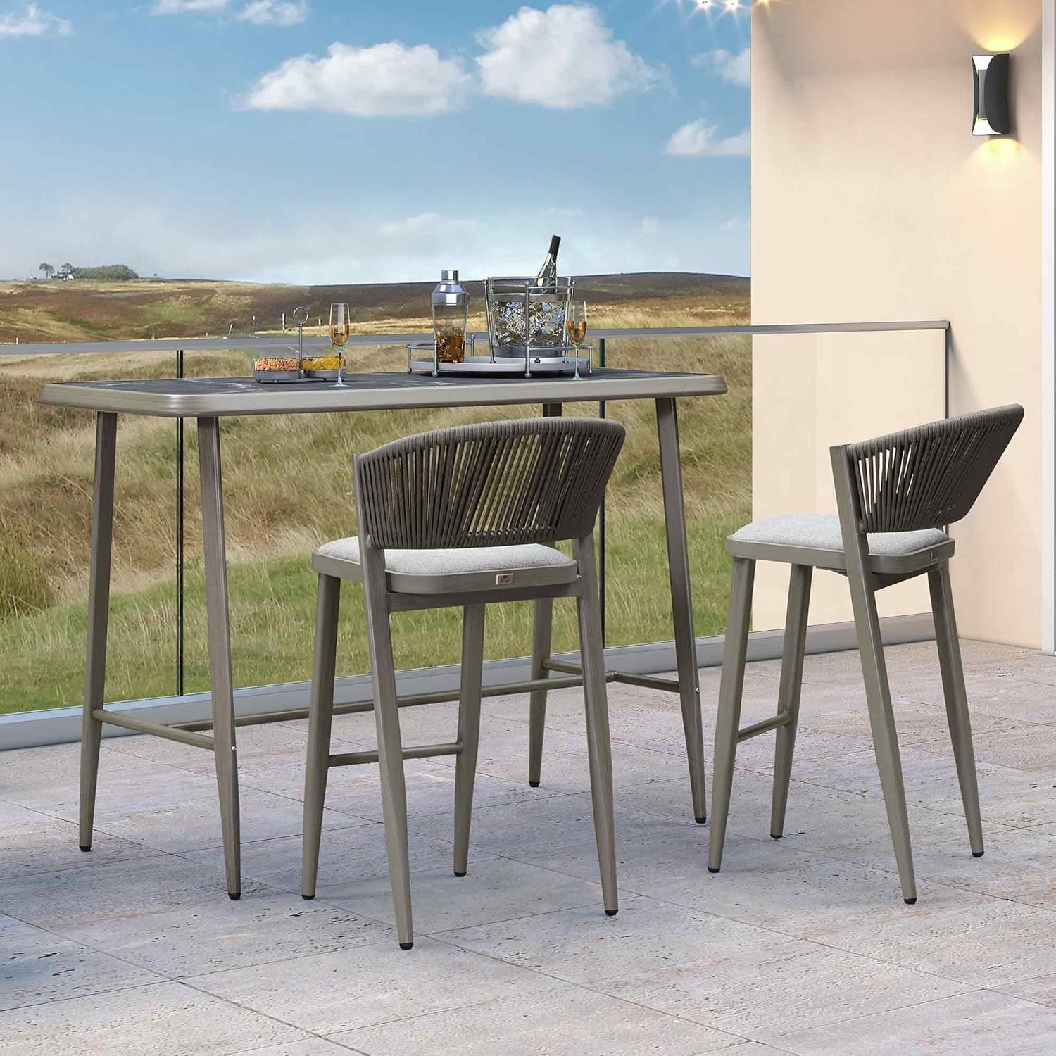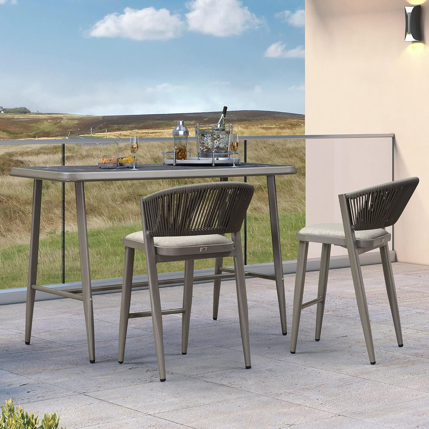 Introducing our modern bar set, meticulously designed with a powder-coated aluminum frame, woven rattan accents, and a shell-shaped backrest for comfort and style. This contemporary piece blends functionality with aesthetic appeal, ideal for both indoor and outdoor settings. Crafted from lightweight yet durable aluminum, the frame is treated with a powder coating for enhanced durability. This ensures longevity and ease of maintenance, making the bar table set suitable for various environments, from stylish bars and restaurants to casual home dining spaces. The bar chair's unique shell-shaped backrest provides ergonomic support while adding a touch of sophistication to its design. Adding to its appeal, the chair features intricately woven rattan detailing along the sides and back. This material not only enhances the chair's visual appeal but also adds a tactile element, providing a comfortable seating experience that invites relaxation. Designed with versatility in mind, our modern bar chair effortlessly adapts to different interior styles and outdoor environments.