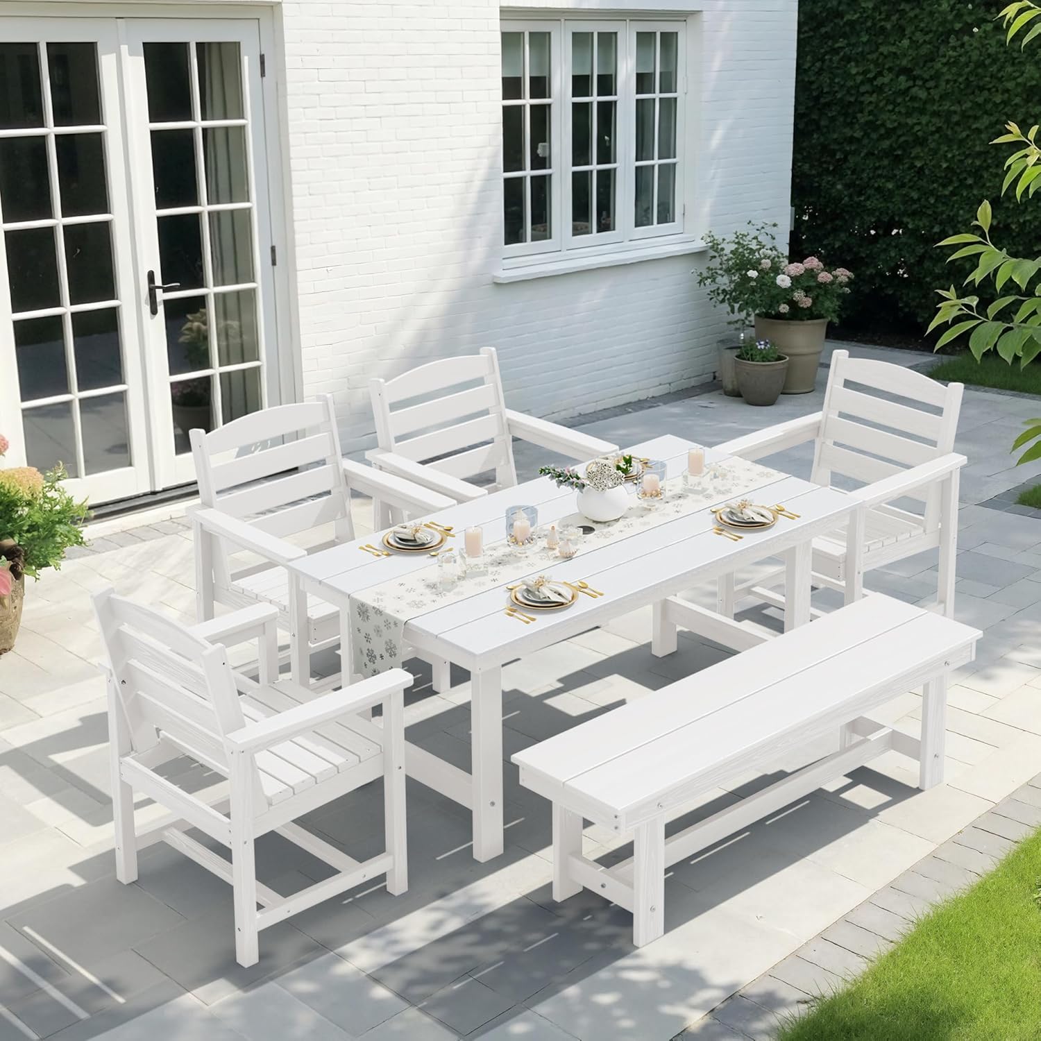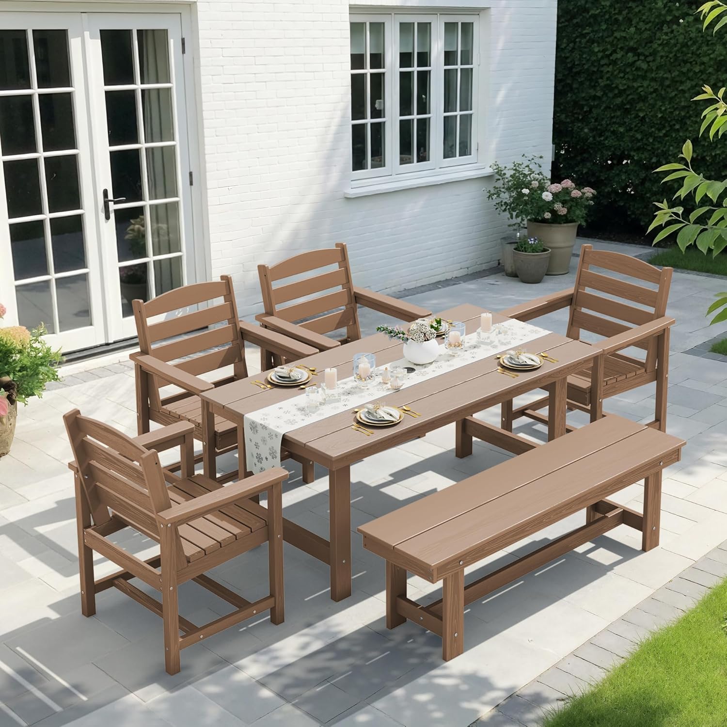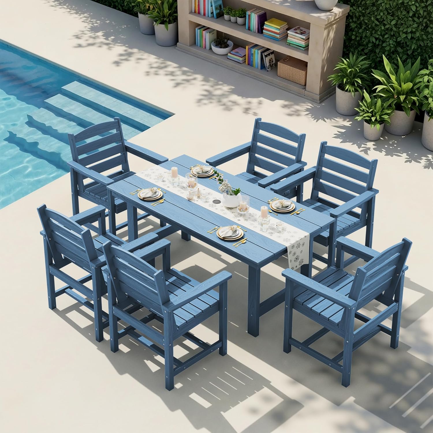 All Weather Outdoor Dining Table with Umbrella Hole, HDPE Rectangular Patio Table for Backyard, Garden, Porch, Deck