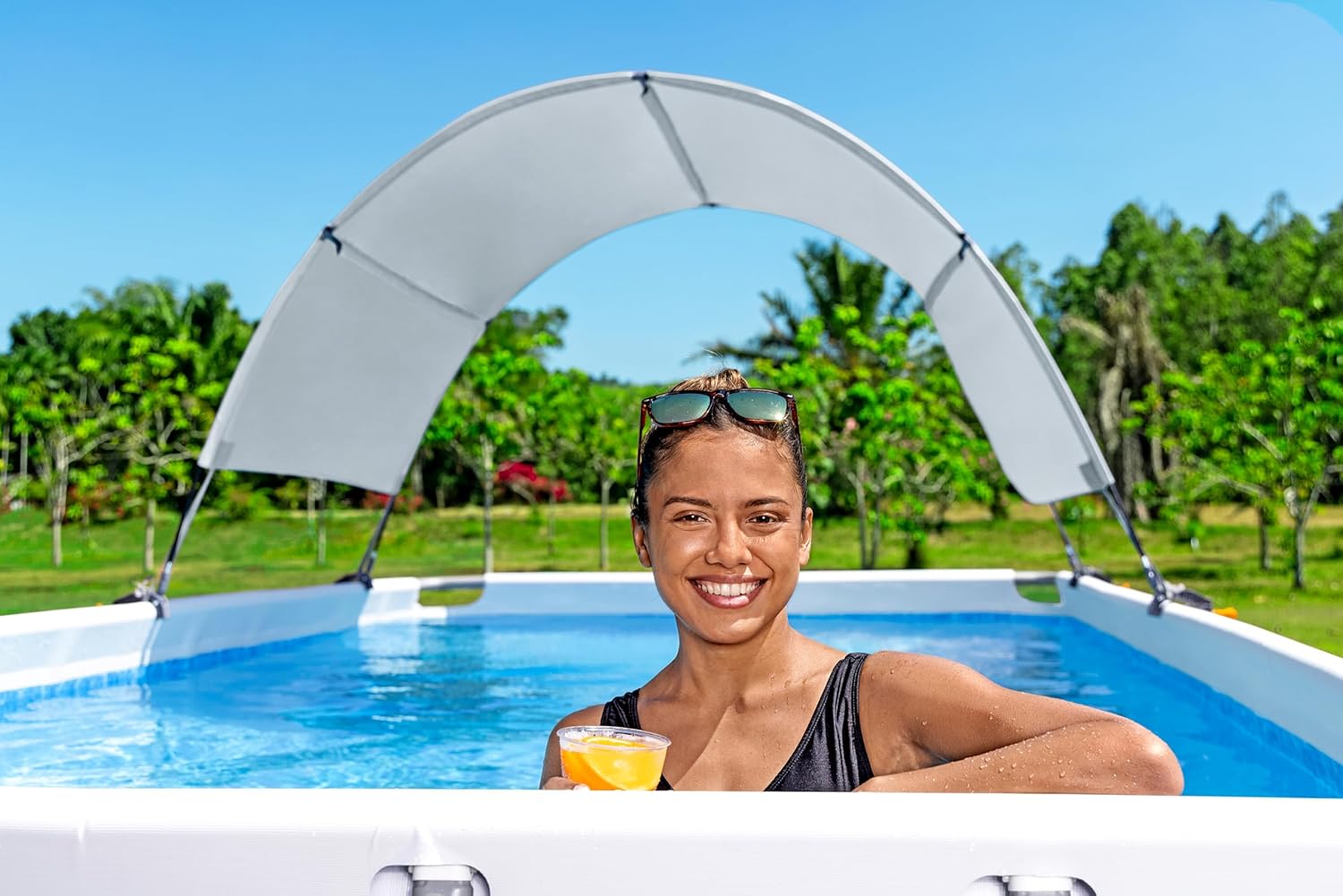 Enjoy the summer sunshine and skip the harsh rays with the Flowclear Pool Canopy. This one-layer, rounded canopy can easily be attached to and detached from most rectangular or oval above ground pool frames with diameters between 2.10 m (6 ft. 11 in.) - 3.40 m (11 ft. 2 in.). The rounded canopy is made of a special material to provide UPF 40+ sun protection, blocking damaging UV rays. The fabric is also fade-resistant so it can stay looking fresh for many summers to come. Set up is quick and easy, only taking about 10 minutes. Stay nice and cool all summer long with the Flowclear Pool Canopy!