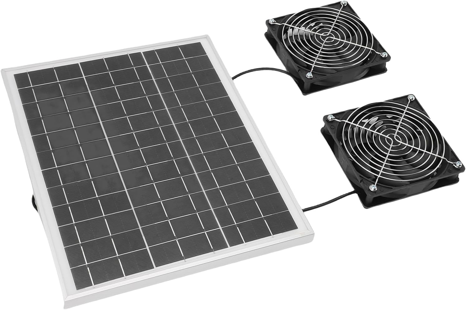 Specifications: Item Type: Solar Powered Dual Fan Kit Material: ABS+Alloy Solar Panel Power: 75W (without electric power storage function) Voltage: 18V Solar Panel Size: Approx. 32x27cm / 12.60x10.63in Fan Size: Approx. 12x12cm / 4.72x4.72in Speed: 3000-4000 RPM Application: Kitchen, Greenhouse, Pet Room, Chicken Coop, Treehouse, RV, etc. Waterproofing Level: IPX7 Solar Panel + Fan Installation Range: Approx. 0.5+1.9m / 1.64+6.23ft Weight: Approx. 1138.00g / 40.14oz Voltage Parameter How to Use Follow the instructions in the user manual Package List 1 x Solar Panel 2 x Fans 1 x User Manual 38 x Accessories
