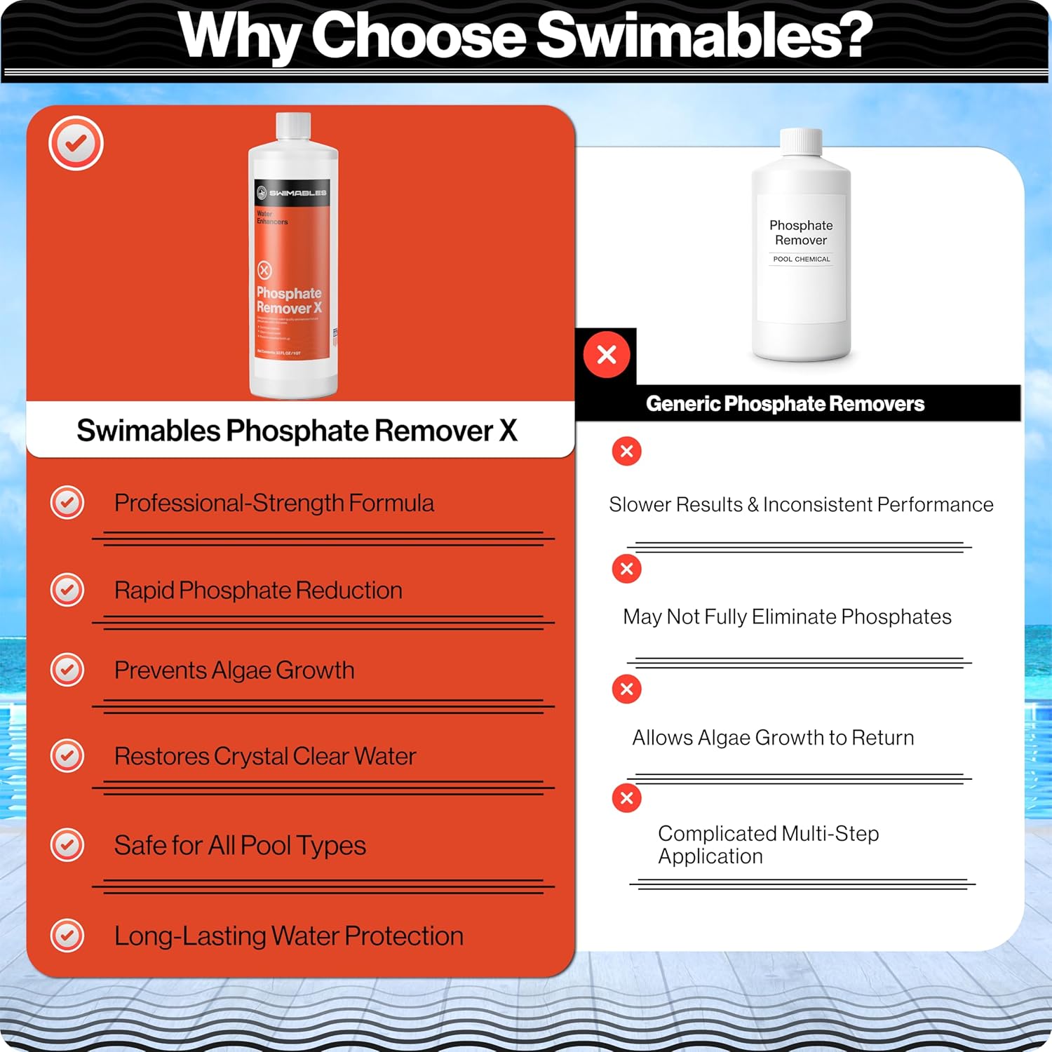 Transform your pool into a crystal-clear oasis with Swimables SW-52-032 Phosphate X - Quart (32oz), the ultimate solution for maintaining clean, healthy water. Phosphates are among the leading causes of algae growth and cloudy water in both in-ground and above-ground pools. Our professional-strength formula is designed to rapidly reduce phosphate levels, preventing unwanted algae, improving water clarity, and keeping your pool visually stunning. Safe for all pool types, including chlorine, saltwater, and mineral systems, this ensures your pool surfaces, equipment, and filtration systems remain protected while maintaining optimal performance.With Swimables Phosphate X, you’ll enjoy hassle-free application and long-lasting results. Simply follow the easy instructions for a one-time treatment, and keep your pool phosphate-free with occasional maintenance. This powerful yet safe formula supports healthier water, frequent cleaning needs, and enhances your swimming experience. Perfect for residential and commercial pools, it ensures a sparkling, inviting environment for family, friends, and guests. Make your pool maintenance simple, efficient, and effective with Swimables, and experience superior water clarity and lasting pool health today.