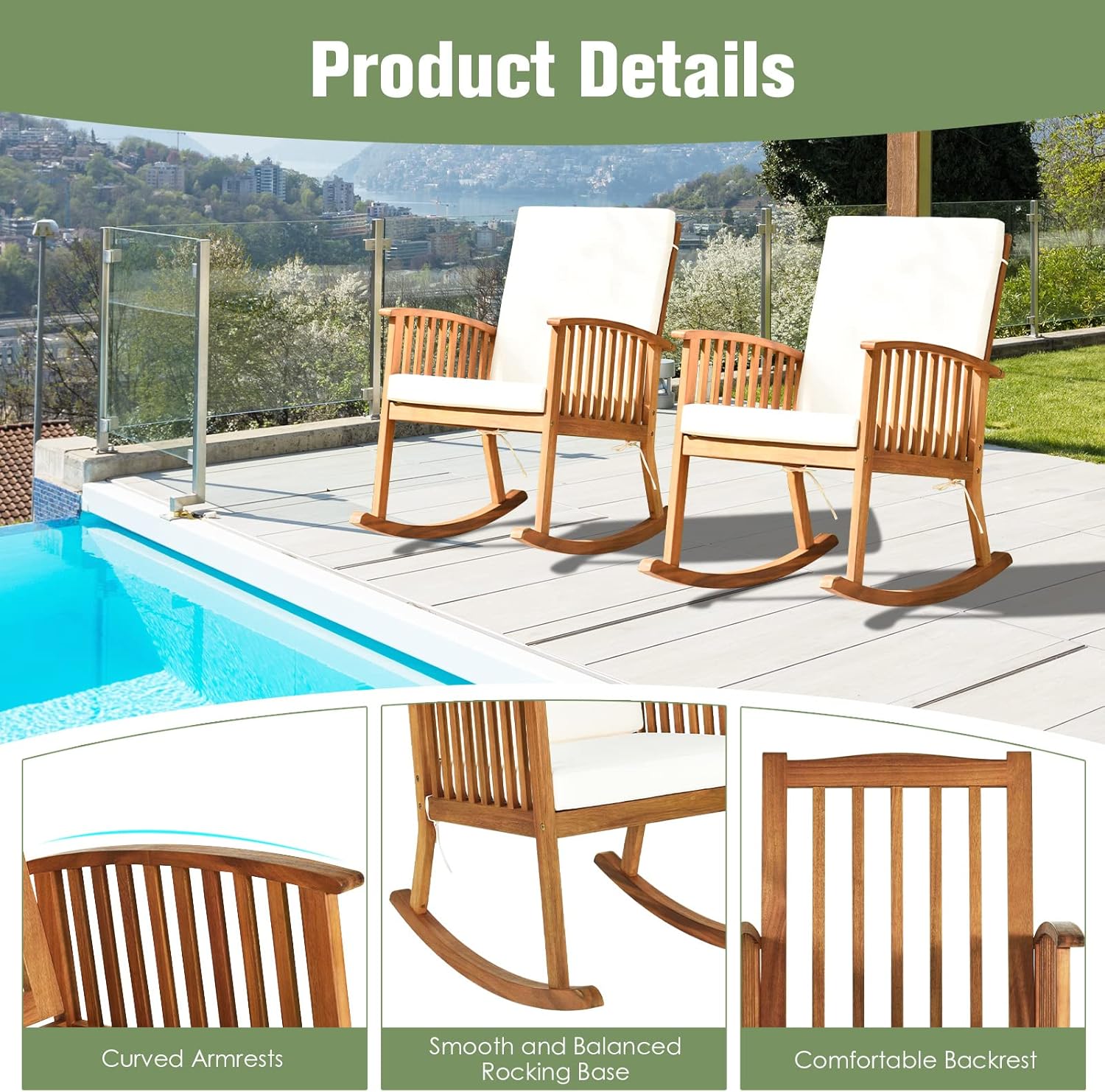 Description: Relax with comfort and ease on this acacia wood rocking chair! The ergonomic seat with wide sitting area will effectively relieve your fatigue and stress. The gentle and smooth rocking design offers more comfort to you. Also, the seat and back cushions highly improve the comfort level. Apart from the coziness, the rocking chair also features high stability and durability thanks to the solid acacia wood frame. If you are looking for a rocking chair for outdoor places, this patio acacia wood rocking chair will be a perfect choice. Features: Safe and smooth rocking makes you more relaxed Ergonomic armrests and backrest relieve your fatigue Made of top-grade acacia wood for high stability and durability Withstand up to 355 lbs heavy weight Soft seat and back cushions make the chair much cozier Smooth zippers make cushion covers easy to remove and maintain Fixing ropes prevent the cushions from moving around Suitable for front porch, balcony, garden and so on Easy to assemble with the clear instruction Specifications: Color of Frame: Natural Color of Cushion: Off White Material: Acacia Wood, Polyester, Sponge Overall Dimension: 35.5" x 25" x 36.5" (L x W x H) Seat Height from the Ground: 17.5" Dimension of Back Cushion: 22.5" x 21.5" x 2" (L x W x Thickness) Dimension of Seat Cushion: 21.5" x 22" x 3" (L x W x Thickness) Net Weight: 26.5 lbs Weight Capacity: 355 lbs Package Includes: 1 x Chair 1 x Back Cushion 1 x Seat Cushion 1 x Instruction