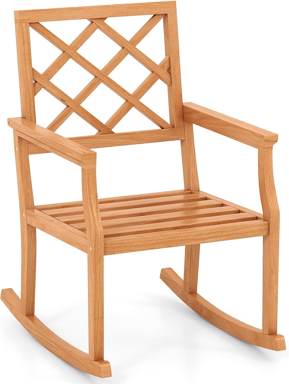 DescriptionRelax in style and comfort with our outdoor rocking chair! Made from solid teak wood, this porch rocker is not only sturdy but also designed to support up to 400 lbs. The gentle rocking motion is perfect for relaxing after a long day, with the slatted seat ensuring a comfortable seating experience. The ergonomic backrest and armrests provide added support, making this rocking chair the ultimate choice for outdoor relaxation. Whether on a patio, in a backyard, by the pool, or on a porch, this stylish and functional outdoor rocker chair will elevate the ambiance of any outdoor space.FeatureSoothing rocking function provides you with optimal relaxationIndonesian teak wood material with natural and sturdy featuresAccommodate up to 330 lbs with a stable constructionSupportive backrest ensures better protection for your spineOffer places to rest your arms thanks to humanized armrestsSpacious slatted seat for a comfortable seating experienceIdeal for reading, basking, relaxing and other outdoor activitiesPerfect addition to your patio, backyard, poolside, or porch areaSpecificationColor: NaturalMaterial: Teak WoodProduct Dimensions: 32” x 28” x 35” (L x W x H) Size of Seat: 26” x 23.5” (W x D) Seat Height: 14.5” Net Weight: 27.5 lbsWeight Capacity: 330 lbsPackage Includes: 1 x Rocking Chair1 x Instruction