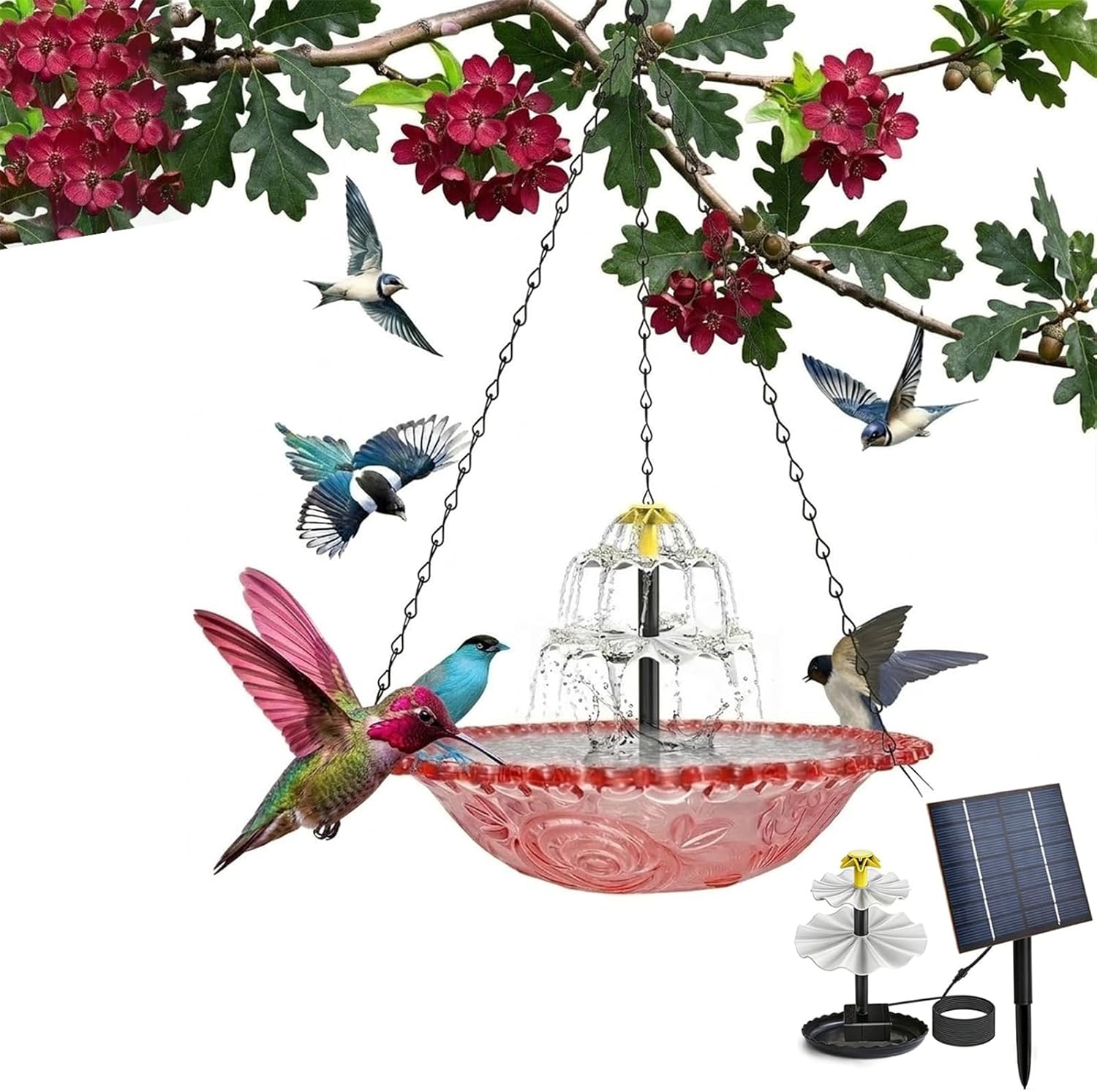 Features Elegant Design: Features a stunning three-layer cascade that enhances gardens, patios, and backyards Bird Attraction: Specifically draws hummingbirds with a refreshing water source for a tranquil atmosphere Lightweight Build: Made from PP and metal, weighing only 450g (0.99lbs) for easy handling Simple Setup: Includes a hanging chain and hook for effortless installation and repositioning Color Choices: Available in blue, pink, purple, and gray to complement outdoor decor Specification: Material: PP, Metal Colors: Blue, Pink, Purple, Gray Weight: 450g/0.99lbs Dimensions: 23.5*46cm/9.25*18in Total Height: 18 inches/45 cm Bowl Diameter: 9.25 inches/23.5 cm Installation: Hanging chain with hook (Included) Ideal For: Outdoor gardens, patios, terraces, and backyard decoration Package Includes: 1pcs * 2026 solar cascade hanging bird bath fountain 3 layers outdoor water feature for hummingbirds easy c NOTE 1.Please allow 1-2cm differs due to manual measurement. 2.Due to the display and light, the picture may not show the actual color of the item. Thanks for your understanding.