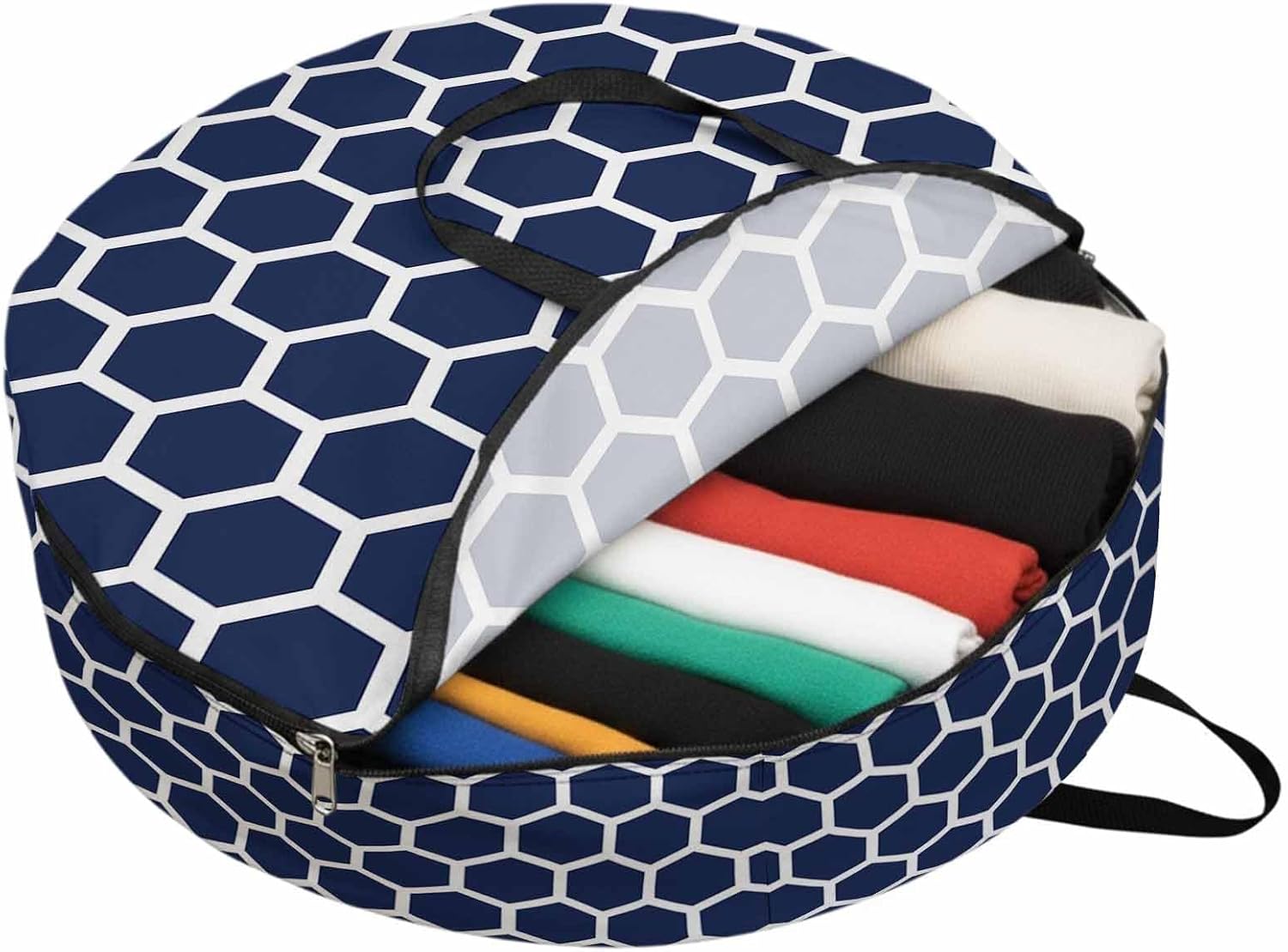 Reclaim Your Closet Space with the Round Storage Solution! Material: polyester Diameters: 24 inch, 30 inch, 36 inch Depth: 7 inches Package Includes: Round Storage Bag One Bag, Endless Possibilities: Whether you are swapping out your summer wardrobe, moving into a new dorm, or packing away holiday decorations, this bag has you covered. The circular design is uniquely suited for: Bedding: Comforters, quilts, sheet sets, and oversized pillows. Clothing: Winter coats, sweaters, and bulky ski gear. Home Decor: Holiday wreaths, garlands, and floral arrangements. Outdoor Gear: Camping blankets, sleeping bags, and beach towels. Dual Zippers: The high quality double zipper design allows the closet organizer to open wide from both sides, making it effortless to load and unload even the bulkiest comforters or wreaths. Reinforced Handles: Sturdy, reinforced handles are securely stitched to provide extra strength and a comfortable grip when carrying heavy loads or pulling the bag from under a bed. Clear Label Pocket: A transparent built-in label holder allows you to quickly identify the contents of each bag without ever having to unzip it, keeping your storage perfectly organized.