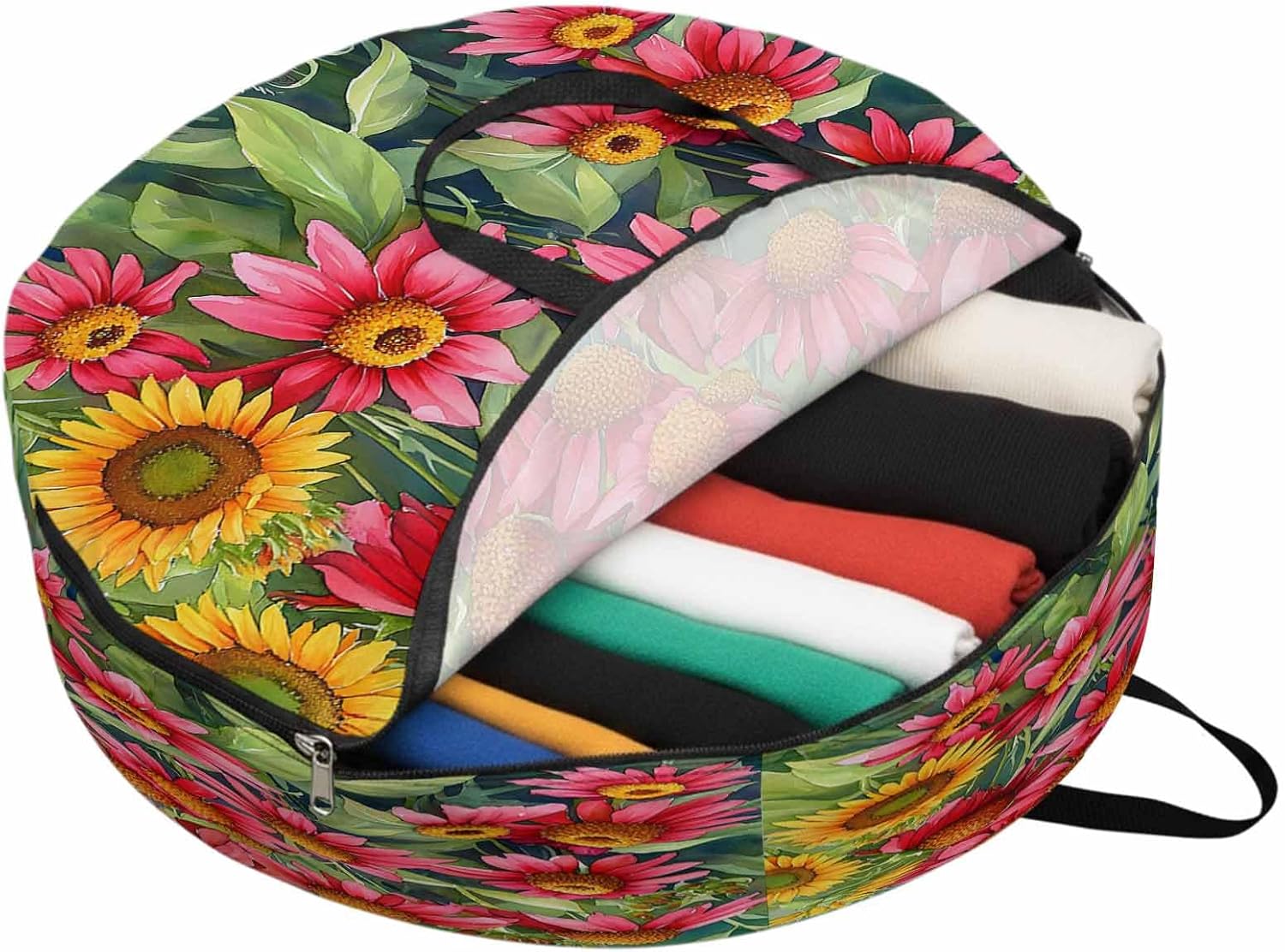 Reclaim Your Closet Space with the Round Storage Solution! Material: polyester Diameters: 24 inch, 30 inch, 36 inch Depth: 7 inches Package Includes: Round Storage Bag One Bag, Endless Possibilities: Whether you are swapping out your summer wardrobe, moving into a new dorm, or packing away holiday decorations, this bag has you covered. The circular design is uniquely suited for: Bedding: Comforters, quilts, sheet sets, and oversized pillows. Clothing: Winter coats, sweaters, and bulky ski gear. Home Decor: Holiday wreaths, garlands, and floral arrangements. Outdoor Gear: Camping blankets, sleeping bags, and beach towels. Dual Zippers: The high quality double zipper design allows the closet organizer to open wide from both sides, making it effortless to load and unload even the bulkiest comforters or wreaths. Reinforced Handles: Sturdy, reinforced handles are securely stitched to provide extra strength and a comfortable grip when carrying heavy loads or pulling the bag from under a bed. Clear Label Pocket: A transparent built-in label holder allows you to quickly identify the contents of each bag without ever having to unzip it, keeping your storage perfectly organized.