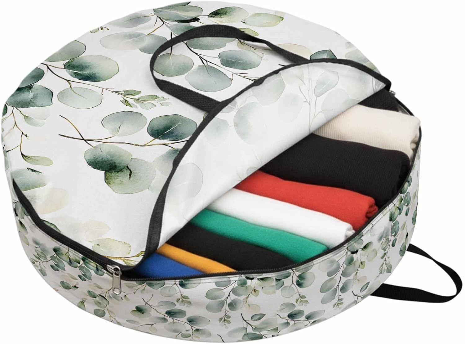 Reclaim Your Closet Space with the Round Storage Solution! Material: polyester Diameters: 24 inch, 30 inch, 36 inch Depth: 7 inches Package Includes: Round Storage Bag One Bag, Endless Possibilities: Whether you are swapping out your summer wardrobe, moving into a new dorm, or packing away holiday decorations, this bag has you covered. The circular design is uniquely suited for: Bedding: Comforters, quilts, sheet sets, and oversized pillows. Clothing: Winter coats, sweaters, and bulky ski gear. Home Decor: Holiday wreaths, garlands, and floral arrangements. Outdoor Gear: Camping blankets, sleeping bags, and beach towels. Dual Zippers: The high quality double zipper design allows the closet organizer to open wide from both sides, making it effortless to load and unload even the bulkiest comforters or wreaths. Reinforced Handles: Sturdy, reinforced handles are securely stitched to provide extra strength and a comfortable grip when carrying heavy loads or pulling the bag from under a bed. Clear Label Pocket: A transparent built-in label holder allows you to quickly identify the contents of each bag without ever having to unzip it, keeping your storage perfectly organized.