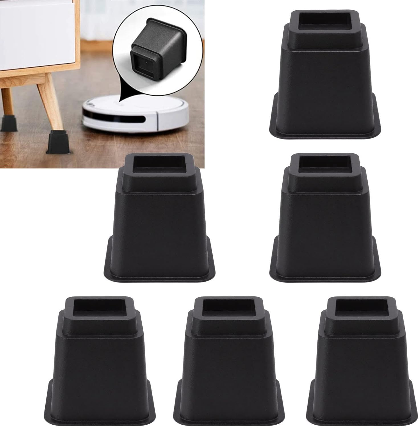 1. [ERGONOMIC DESIGN] The 5in high bed risers offer a safer biomechanical advantage with their ergonomic height 2. [INCREASED STORAGE SPACE] These furniture risers provide more space under the bed for storage and 3. [ANTI-SLIP PROPERTIES] Made of high-strength plastic, these bed risers enhance stability and anti-slip properties 4. [VERSATILE USAGE] Suitable for all types of furniture, these risers protect legs and provide better stability 5. [EASY TO USE] Simply place them at the foot of a table or bed for instant elevation Spec: Item Type: Bed Risers Material: Plastic Product Size: Approx. 16 x 16 x 15cm / 6.3 x 6.3 x 5.9in Colour: Black Product Height Size: 5in (furniture feet are placed on the product to increase by 5in) Uses: Furniture Foot Pads Weight: Approx. 1810g/63.8oz How to Use: Use at the foot of a table or bed PackageList: 6 x Bed Risers