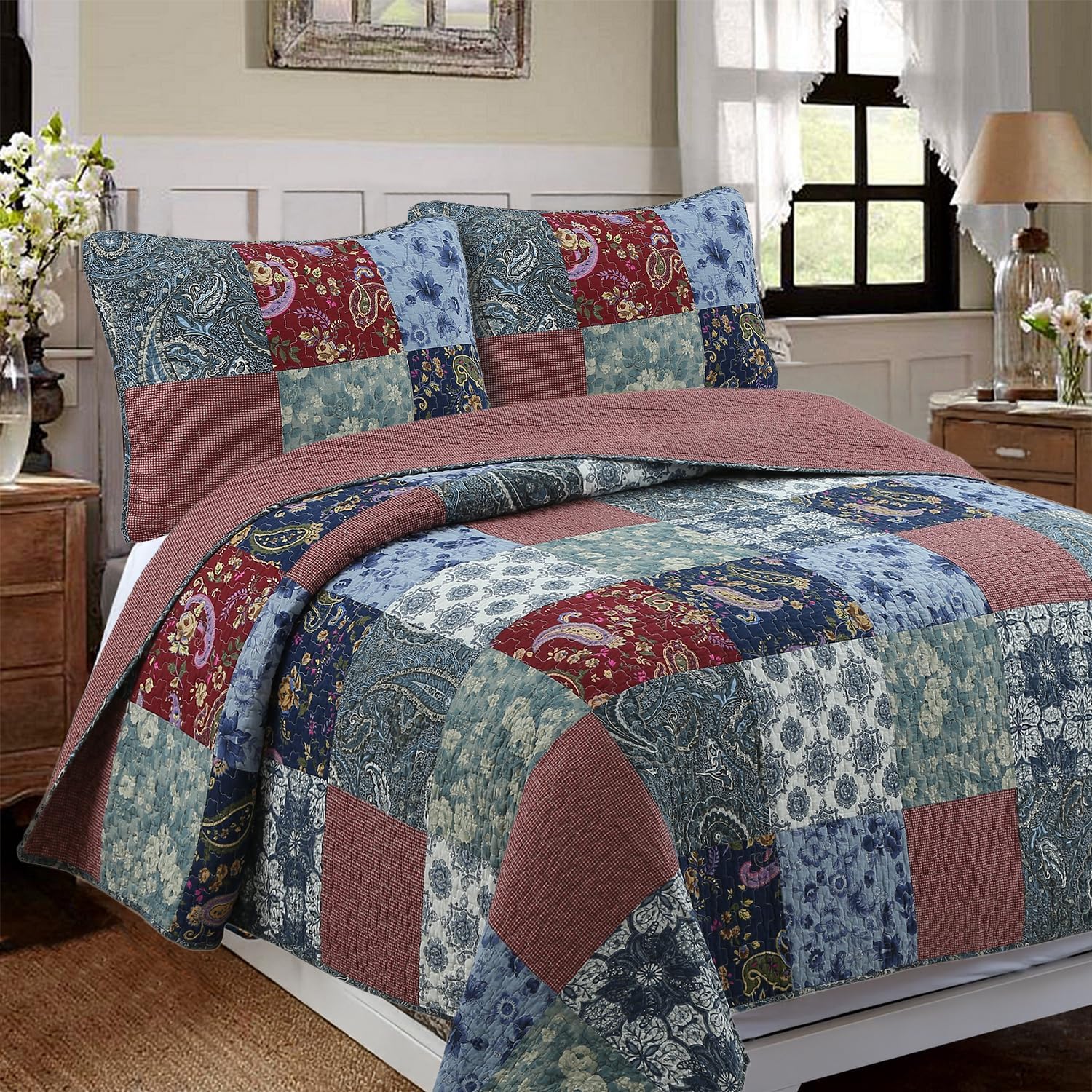 Bring a charming country western farmhouse feel to your bedroom decor with this quilt set. Rich color tones of red, blue, green, and tan in various floral prints all patchwork together wonderfully. Quilt set serves as a beautiful focal point in your bedroom or guest room. This 100% Cotton quilt set is reversible so that you can quickly and easily change the look of your room. Set is simply gorgeous and offered in Twin, Queen, and King. With its easy-care machine-washable cotton material, this quilt set is easy and quick to launder.