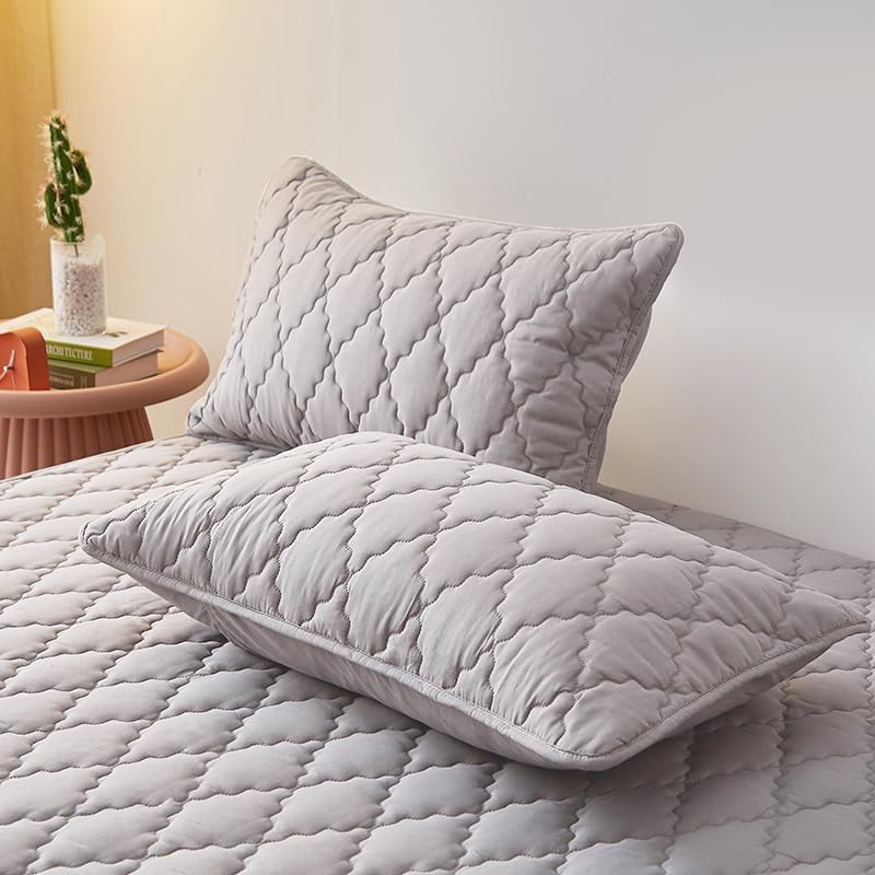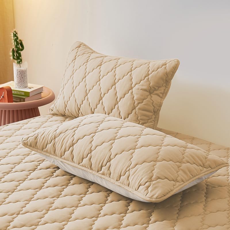 Comfortable and Breathable Fitted Sheet ltra-soft and Breathable Made of thicker filling, the unique airflow system is permeable for fresh air & moisture, our mattress cover brings you a sweet dream. Deep Pocket Design Side skirts adopt elastic fitting technology, our mattress protector can adjust most regular mattresses tightly. 360° Protection This mattress cover ensures hugs each corner of your mattress to keep it in place throughout the night without bunching, sliding, or coming off. Quiet Sleep The noiseless fabric brings you comfortable sleep without a crinkling sound or plastic feel. The mattress protector waterproof will provide a great convenience for your golden sleep. Easy Care & Clean You only take the waterproof mattress protector off & slip it in your washing machine and then low tumble dry. Size: Twin: 36"x75" (91x190cm) Twin XL: 47"x80" (120x203cm) Queen: 60"x80" (152x203cm) King: 72"x80" (183x203cm) Cal King: 72"x84" (183x214cm) Cal King: 78"x86" (198x216cm) 2 Pillowcases Size: 19"x29" (48x74cm) Package includes: 1PCS x Mattress Protector (Not Include Pillowcases, Pillowcase Needs to Be Purchased Separately) Notes: 1.Due to manual measurement, there is a certain error in the product size. 2.Due to lighting effects and shooting angles, there may be chromatic aberration in the product, please understand.