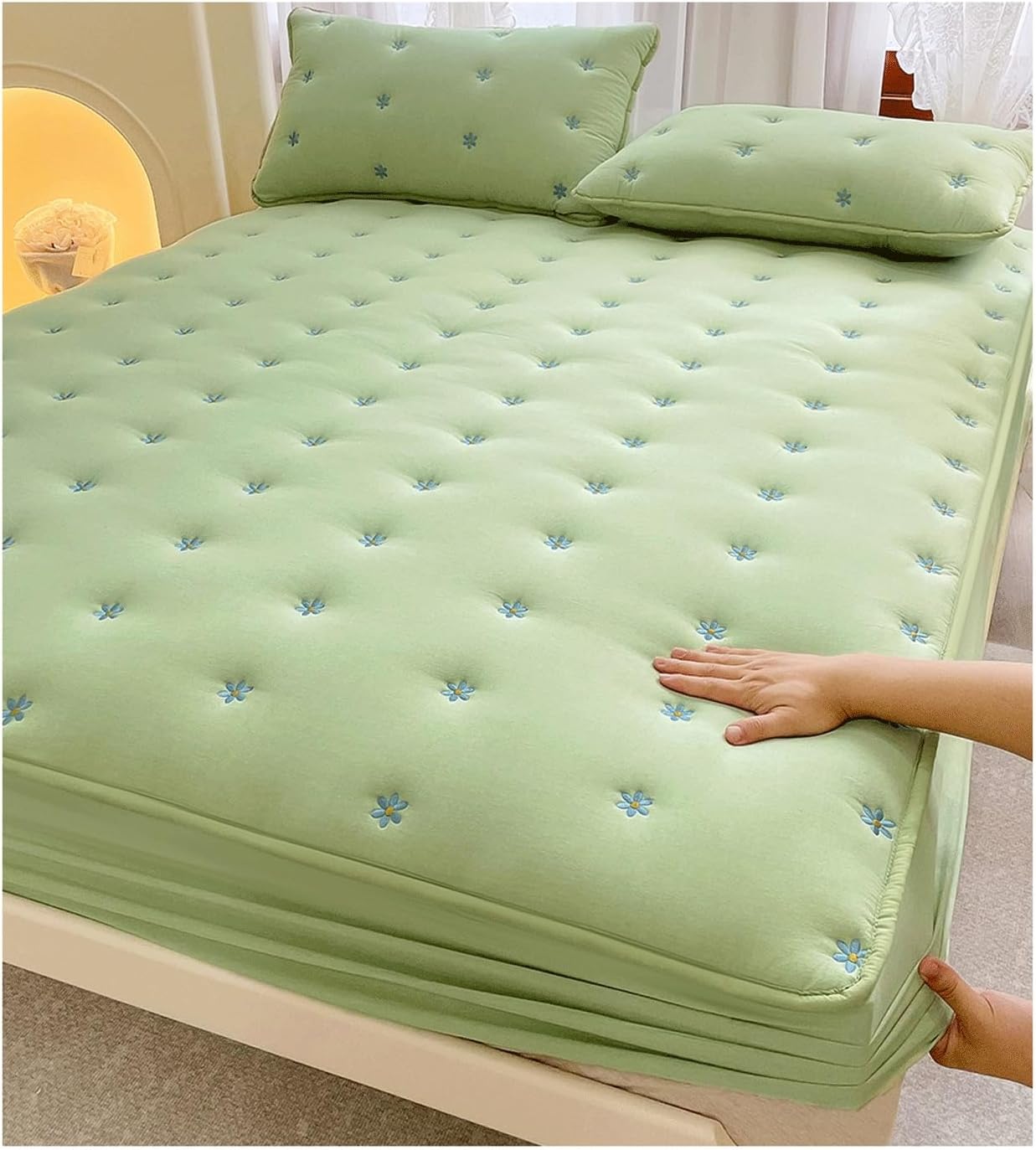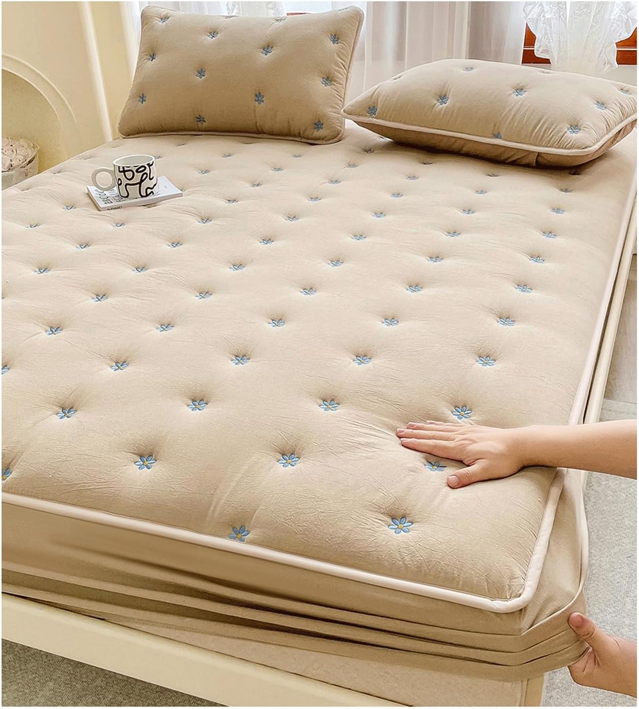 Mattress Pad - Quilted Fitted Mattress Protector for Mattresses - Breathable Mattress Cover with Elastic - Comfortable and Soft Mattress PadAvailable Size : Included :1 Quilted Mattress PadTwin / Single Size Mattress Pad 90x200+30cm / 35.43 x 78.74 + 11.81 inch;Small Double Size Mattress Pad 120x200+30cm / 47.24 x 78.74 + 11.81 inch;Queen Size Mattress Pad 150x200+30cm / 59.05 x 78.74 + 11.81 inch;Super King Size Mattress Pad 180x200+30cm / 70.86 x 78.74 + 11.81 inch ;Mattress Pad 200X220+30cm / 78.74 x 86.61 + 11.81 inch ;Mattress Pad with Pillowcase (3pcs)90x200cm+48x74cm x2Included :1 Mattress Pad 90x200cm + 2 x Pillowcases 48x74cm120x200cm+48x74cm x2 , Included :1 Mattress Pad 120x200cm + 2 x Pillowcases 48x74cm150x200cm+48x74cm x2 , Included :1 Mattress Pad 150x200cm + 2 x Pillowcases 48x74cm180x200cm+48x74cm x2 , Included :1 Mattress Pad 180x200cm + 2 x Pillowcases 48x74cm200x220cm+48x74cm x2 , Included :1 Mattress Pad 200x220cm + 2 x Pillowcases 48x74cmAbout color differencesProducts in different light and different monitors under the reality of the color is different, those who do not mind, please be careful to shoot.Warm tips:1, dark-colored fabrics will have a slight floating color when the first wash, is a normal phenomenon, before washing, can add a little salt, can play a role in fixing the color.2, different colors of fabrics, please separate washing, so as not to stain each other.