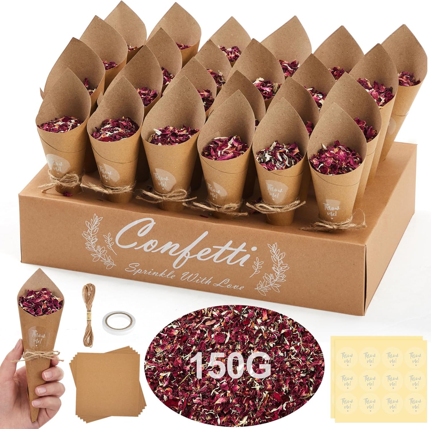 Features: If you have friends, colleagues or family members around to hold a wedding, you can give the party confetti cone holder as a gift to them, which will show your kindness and care to them. Other Attempts - Some people also use it as a cupcake stand. The blank confetti cone paper can DIY drawing when using. Hope you have a good day. Specifications: Material: cardboard Color: brown, white Package includes: 24 x Paper cone 1 x Cone Stand Box 1 x Dried Flowers 24 X “throw me”Sticks 1 x Dried Flowers 1 x Rope 1 x Spoon Notes: Manual measurement, please allow slight errors on size. The color may exist a slight difference due to different screen displays