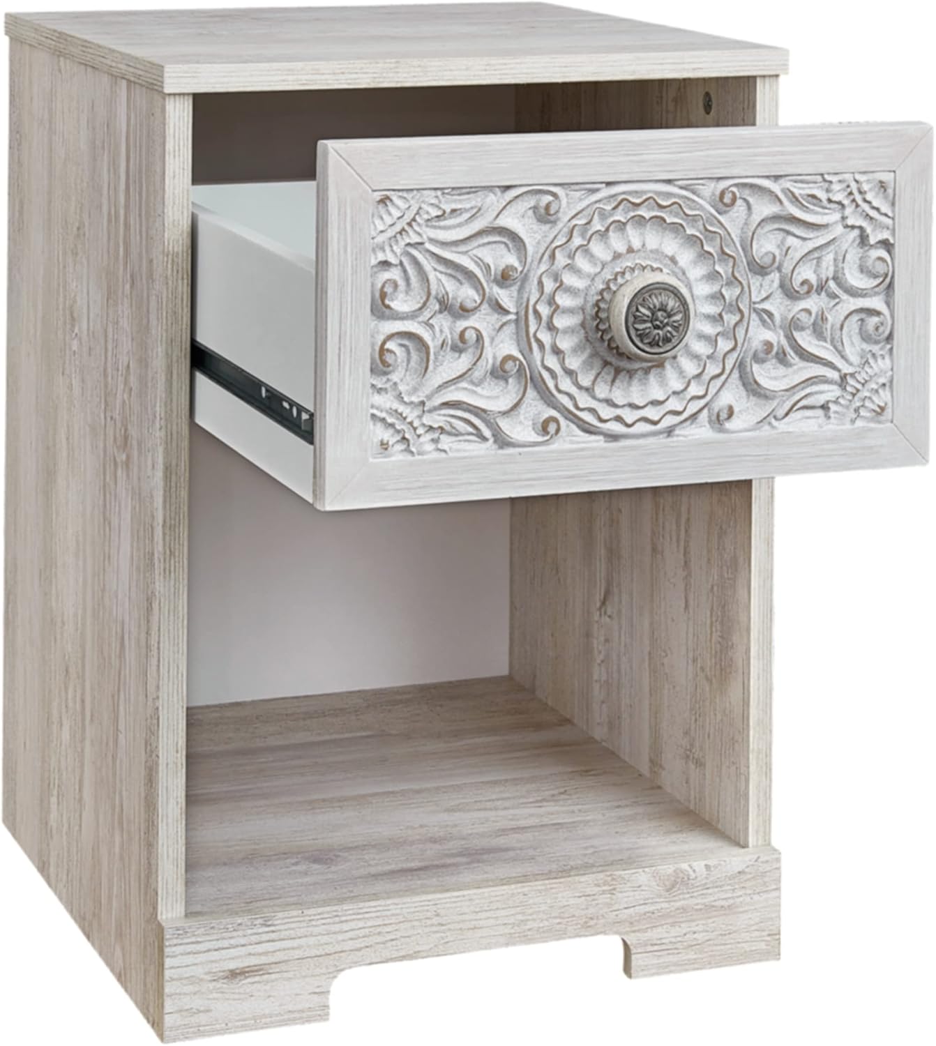 If it’s coastal chic or cottage quaint style you long for, the Paxberry whitewashed nightstand invites you to go to town. Its distinctive weatherworn finish conveys an easy-breezy sensibility, perfect for a restful bedroom retreat. Rest assured, tastefully edited lines and medallion drawer pulls give this attractively priced nightstand a high-end aesthetic.