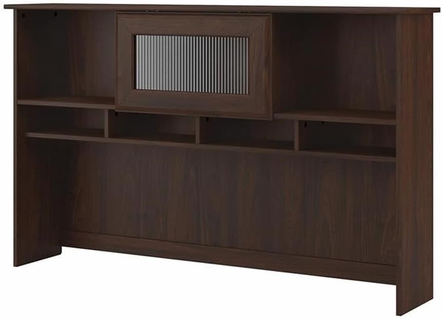 The elegant design of the Pemberly Row 60W Desk Hutch adds plenty of practical storage space to any home office. Used with the coordinating L Shaped Computer Desk or Corner Desk with Storage (sold separately), the Hutch offers a place for reference materials, supplies, decorations and more. Four open cubby shelves provide easy access to papers or work-in-progress to keep you on task. Two tall compartments handle oversized books, binders, manuals or decorations. A stylish fluted glass door delivers a sophisticated touch while concealing unsightly materials and supplies. Organize your cords with an integrated cable management system. Conveniently, the computer hutch can be attached to either side of the L Shaped Desk for a custom configuration. The 60W Hutch meets ANSI/BIFMA quality standards for safety and performance and is Backed by 1 Year Manufacturer's Warranty.Features:- 60W x 12D x 36H Hutch fits on the L Shaped Desk or Corner Desk (sold separately)- 60W Hutch mounts to either side of the L Shaped Computer Desk- Closed storage compartment with fluted glass door that flips up to open- Open work-in-progress compartments help organize projects and keep work surface clutter free- Cable management system keeps computer cords out of the way- Traditional styling comes in your choice of several finishes for a simple yet elegant appearance- Tested to meet ANSI/BIFMA quality standards for safety and performance- Backed by 1 Year Manufacturer's WarrantySpecifications:- Product Dimensions: 60W Hutch: 59.45"W x 11.46"D x 36.30"H- Product Weight: 60.8 lbs