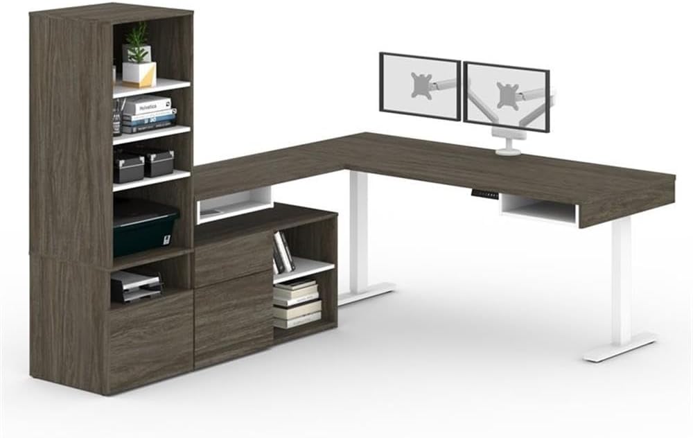 Create two workspaces with this modern desk set. The L-Shaped Standing Desks each offer two open compartments to keep small office supplies within reach. With two fixed shelves and three adjustable shelves each, the Shelving Units accommodate items of various sizes and conceal office clutter in their closed compartments. The Credenzas each feature a box drawer for accessories, a file drawer for documents, and one open compartment with an adjustable shelf for books and more. Free up the work surfaces thanks to the Dual Monitor Arms. North American made with local and imported parts.Features:- Bundle includes: Two 72W L-Shaped Standing Desks, two 20W Shelving Units, two 39W Credenzas, two Dual Monitor Arms with Pistons- High-density commercial-grade particle board work surface is compliant with TSCA Title VI and has a durable melamine finish that resists scratches, stains, and wear- The electric Standing Desks lift from a low of 28 inches to a high of 45 inches at the push of a button; Voltage: 110V- L-Shaped Standing Desks offer 2 open storage compartments each to accommodate office supplies- Shelving units each feature 2 fixed and 3 adjustable shelves for versatile organization and a closed storage area to store objects- Credenzas each offer 1 box drawer for small office supplies, 1 file drawer accepting legal, letter, and A4-size paperwork, and 1 open compartment with 1 adjustable shelf to accommodate larger items- Dual Monitor Arms each accommodate 2 monitors measuring between 17 and 27 inches and weighing between 4.4 and 19.8 lb each and include 2 USB 3.0 ports and 2 audio ports at the base to help you keep necessary equipment within easy reach- Dual Monitor Arms rotate (360-degree rotation capability) and tilt up or down +/- 11 inches, so that you can place the monitors in the most comfortable position for your eyes and neck- Desks meet ANSI/BIFMA quality standards for safety and performance; assembly required (2 people recommended)- Bundle backed by the Bestar 10 Year Manufacturer‘s Warranty, electric mechanism warranted 2 years, monitor arm warranted 1 year; North American made with local and imported partsSpecifications:- Product Weight: 794 lbs