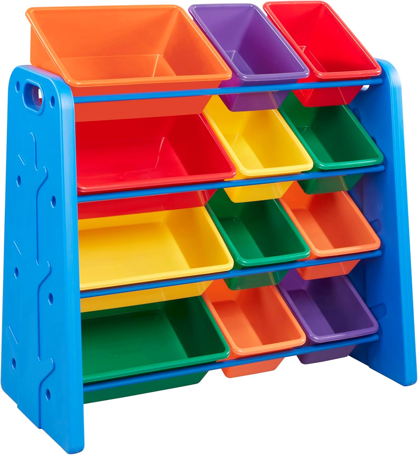 The ECR4Kids Tree Storage Organizer, equipped with 12 plastic bins, offers a whimsical and practical solution for keeping children's bedrooms, playrooms, or family rooms organized. Ideal for home and school use, this open-front storage unit is a great alternative to a traditional toy box. The compact size provides ample storage in a small footprint. Four tiers keep bins at a sloped angle making them easy to access; designed for children, allowing them to independently select and return toys, books, or art supplies. The design promotes self-sufficiency, aiding in the development of autonomy and responsibility. Eight standard and four large-sized bins are constructed with durable plastic and feature rounded edges and a curved interior to easily remove contents. Each lightweight toy bin is easy to remove to bring playtime to the floor, activity table, or outdoors. The playroom essential features adaptability encouraging dynamic interaction with the environment and personal belongings. The sturdy tree-inspired frame has handles on either side making it easy to move, adapting to different organizational needs. The unit features a tip-resistant design, allowing parents to configure the shelf flush to a wall or use two storage racks against each other to create an organization hub.
