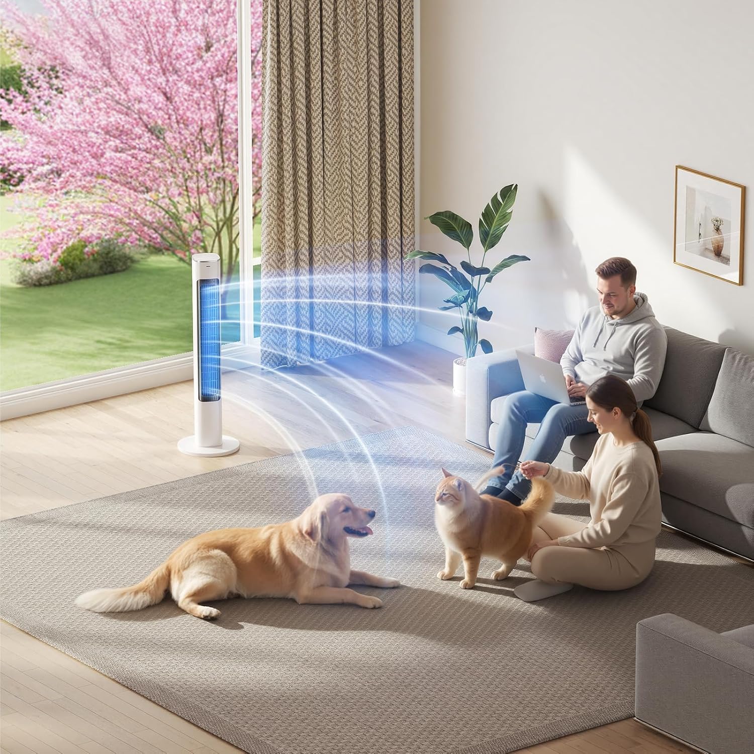 🌬️ Wind-Raising Tower Fan | 40-inch Smart Tower Fan: Top Touchscreen · 90° Wide-Angle Oscillation · Dual-Mode Control 📏 40-inch Wind-Raising Height ➜ Transcends conventional heights for broader airflow coverage, achieving balanced circulation from ceiling to floor 👆 Top Smart Touchscreen ➜ Operate with an elegant tilt—intuitive, seamless interaction eliminates bending to find buttons 🌀 90° Ultra-Wide Angle Oscillation ➜ Sweeps nearly 90° left and right, stirring air throughout the room for coolness without dead zones—delivers airflow up to 8 meters 🍃 4-Speed Precision Airflow ➜ From gentle breezes to powerful circulation, finely tuned for diverse needs and scenarios 📱 Smart IR Remote ➜ Full-function remote control lets you adjust settings effortlessly while lying down or sitting, doubling convenience ⏰ 12-Hour Smart Timer ➜ Preset shutdown from 1 to 12 hours, ensuring worry-free operation during naps or overnight sleep 🎛️ Concealed Handle ➜ Seamlessly integrated into the body for effortless lifting and moving ✨ Product Deep Dive: Redefining Whole-Room Airflow 📏 40-inch floor-standing height Traditional fans deliver flat airflow with limited circulation. The 40-inch column design positions the outlet at an optimal height for indoor aerodynamics. It directs airflow to the upper warm air zone, creating a top-down “shower-style” convection that rapidly balances room temperature. Especially effective when paired with air conditioning, it ensures even cooling distribution for energy savings. 👆 Top Touch Controls + Remote Effortlessly switch speeds, modes, timers, and oscillation with a light touch. The intuitive interface responds instantly, offering a sleek tech aesthetic and easy cleaning. The full-function infrared remote covers all unit features. Whether lounging on the couch or relaxing in bed, stay comfortably cool without getting up. 🌀 90° Ultra-Wide Oscillation Rotates up to 90° left and right, delivering airflow far beyond standard models (typically 60°-80°). This means it effortlessly covers wider living rooms, open dining areas, or entire bedrooms, ensuring every corner feels the moving air for enhanced overall ventilation. 🎛️ Thoughtful Details & Quiet Operation Hidden Handle Design: Seamlessly integrated into the body's contours, it offers a comfortable grip for moving the fan effortlessly between living rooms, bedrooms, and studies. Low-Noise Core: Featuring optimized blades and a silent motor, it operates softly and unobtrusively even at maximum speed, safeguarding your sleep, work, and leisure time.