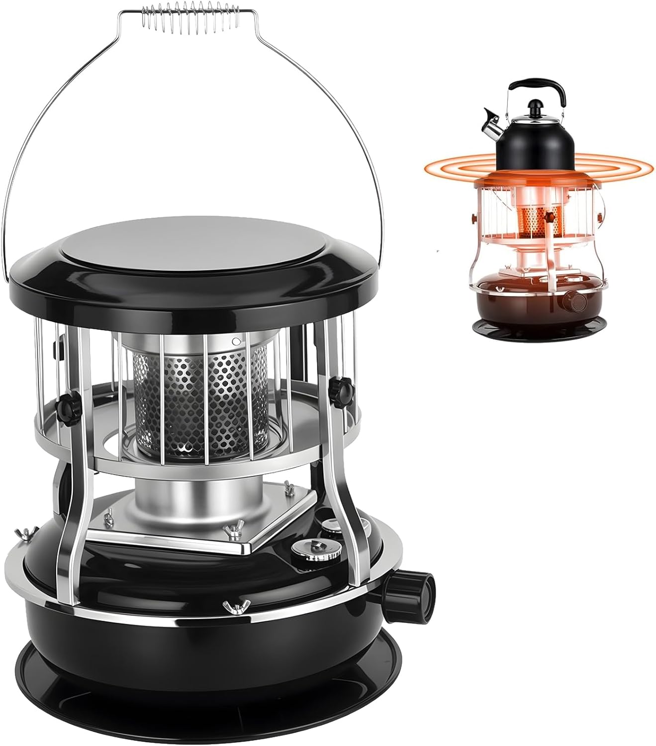 Description:2-in-1 Kerosene Heater: The 2-in-1 Kerosene Heater is a versatile appliance that serves dual purposes, during the day, this efficient heater could be used for cooking, allowing you to boil water or prepare meals on its top surface while providing warmth to your living space. At night, it transitions into a powerful heating solution, warming a room measuring up to 15 square meters in just a few moments. With a heat output of 9000 BTU (2600W), this heater ensures a distribution of warmth throughout the room.16 to 21 Hours of Burning Time: Once you have refueled, you will relish up to 16 to 21 hours of cozy warmth and convenient cooking. This Kerosene Stove's extended burn time significantly reduces the need for frequent refills, ensuring that you maintain a consistent level of comfort and convenience throughout your use.No Electricity Required: This non electric heaters for indoor has a 4.5L fuel capacity, perfect for emergency heating. It uses a radiant heating method for better efficiency. Simply turn the knob to control the flame, ensuring both safety and convenience.Portable Handle: This kerosene heater features a handle for easy portability and mobility. Adjustable in height, it is able to be placed anywhere you need, ensuring warmth wherever you go.Usage scenario: The kerosene stove is ideal for both indoor and outdoor settings. Whether you're heating a room at home or warming up during outdoor activities, it provides excellent warmth. Enhance your camping, ice fishing, and hunting experiences with this reliable heater.Item Name: Kerosene Heaters for Indoor UseMaterial: Stainless SteelHeat Output: 9000 BTUFuel Capacity: 4.5LBurn Time: 16-21 HoursHeating Method: RadiantFeatures: Portable, Non-electric, Radiant HeatingSize Details:L: 33cm/12.99", W: 33cm/12.99", H: 46cm/18.11"Package Includes:1 x 2 in 1 Kerosene Heater and Stove