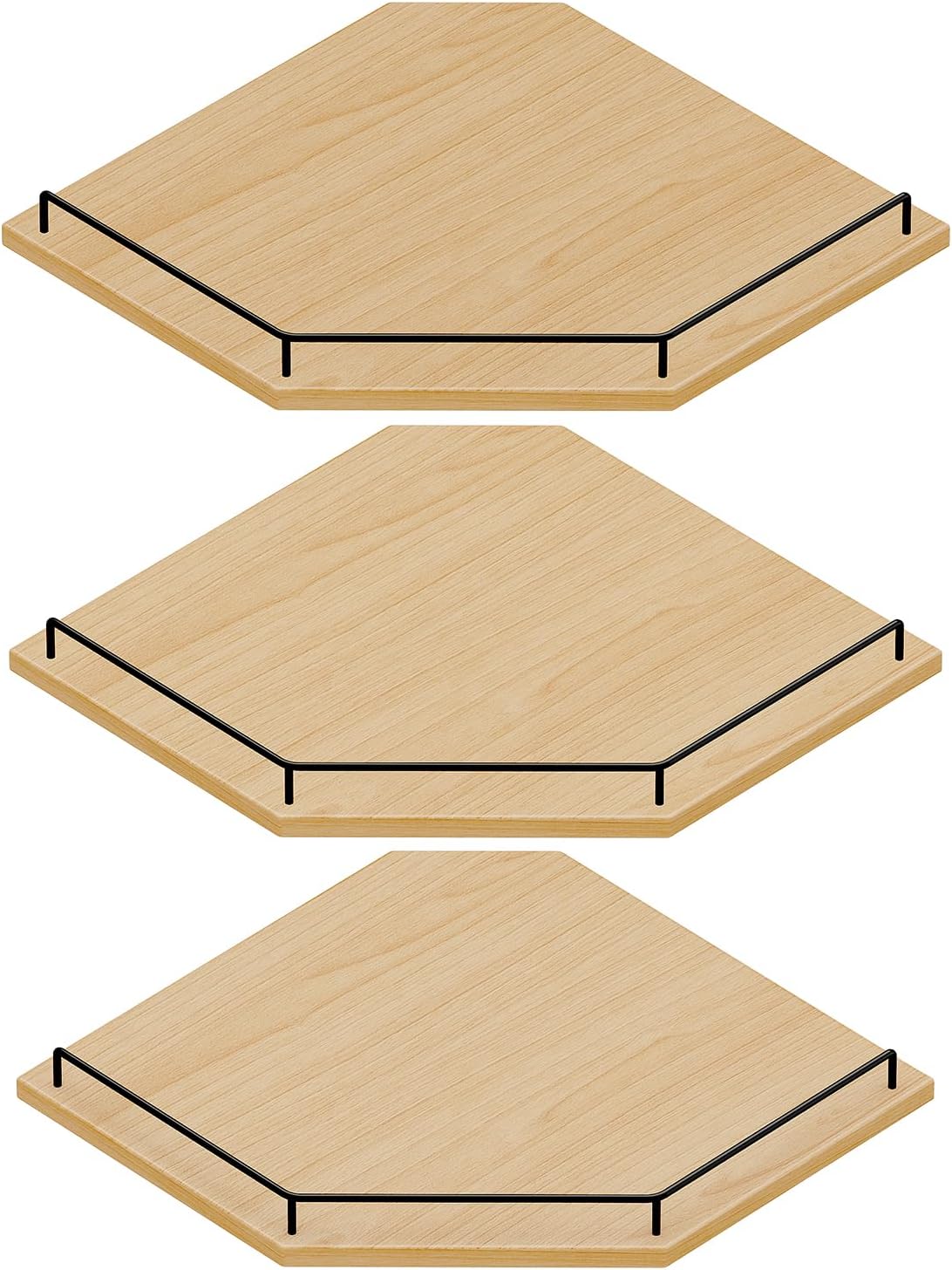 The JJL Corner Wall Shelf—available in 3-tier, with hexagonal options—combines storage functionality and decorative charm, making it the ideal solution for empty wall corners. Equipped with protective guardrails to prevent items from falling, its multi-layer wooden structure frees up valuable floor space while transforming dull corners into elegant, practical display and storage zones. Effortlessly reduce clutter, elevate your modern decor, and maximize vertical storage with this versatile piece. Customize Your Space with Stylish Variations: Choose from two distinctive shapes—sleek hexagonal—to match your interior style. Select between 3-tier configurations based on your storage needs. Available in five versatile colors: white, black, gray wood grain, rust-brown, and natural wood grain, ensuring weamless integration with bedrooms, kitchens, and living rooms alike. Hexagonal and fan-shaped shelves with wire holes are also offered for convenient cable management. Durable Construction for Long-Lasting Use: Crafted from high-quality eco-friendly wood, this corner shelf boasts sturdiness and a natural aesthetic. Paired with high-strength metal brackets, it delivers exceptional stability—each bracket supports up to 40 pounds, safely holding your valuables. Wall installation requires drilling, creating a secure mount that stands firm on both wooden and concrete walls. Versatile for Every Room & Need: Perfect for 90-degree wall corners in bedrooms, living rooms, hallways, kitchens, and even bathrooms. Use it to display small plants, photo frames, collectibles, or decorative accents, with guardrails keeping items securely in place. Shelves with wire holes feature a 3.2-inch back corner cutout to fit large plugs, solving cable chaos for devices like modems, routers, baby monitors, and DVD players.