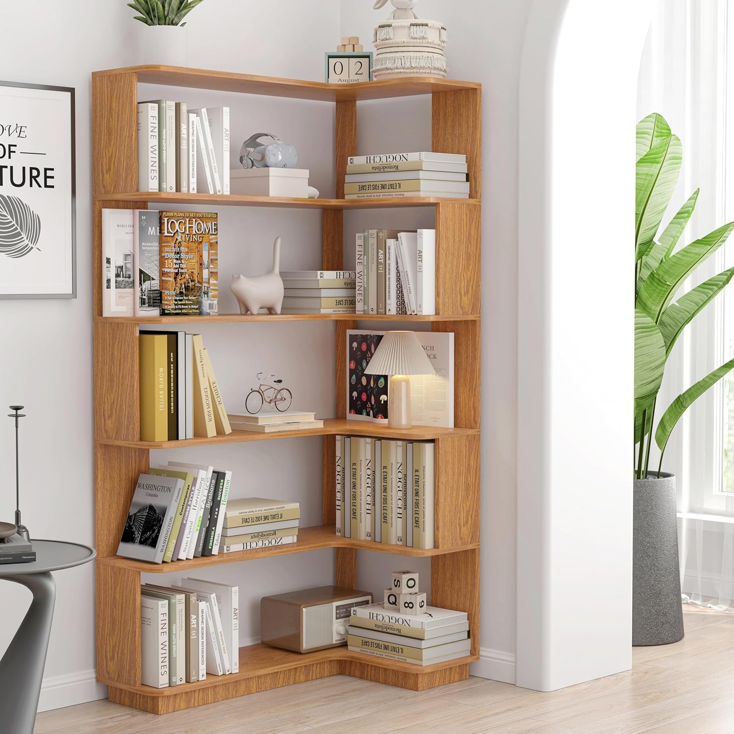 Modern L Shaped Corner Bookshelf for Space OptimizationThis 6 tier tall bookcase is designed to maximize unused corners while adding clean, modern style to your interior.Generous Storage with Vertical Display ShelvesOverall dimensions: 21.65"W × 35.43"D × 64.56"H. Each shelf height measures 11.81", providing ample vertical clearance for large books, magazines, decorative accents, figures, and storage boxes. The 35.43"W extended side increases display capacity compared to standard corner shelves.Durable MDF Construction with Reinforced BaseConstructed from 15mm MDF, this freestanding bookcase features a thickened and reinforced base for improved structural stability. Each shelving shelf supports up to 30 lbs, making it suitable for daily storage and display needs. The 3D wood grain decorative finish is scratch resistant and easy to clean.Open Back Shelving Unit with Protective Side PanelsThe open back design keeps the book shelf visually light while maintaining functional storage. Raised side panels help keep items in place and enhance the overall appearance of this tall bookcase. It works well as bookcase shelves for living room, bedroom, hallway, or office shelves.Color & Wood Grain NoticeThe surface uses 3D decorative wood grain paper. Patterns may vary slightly from product images. Color appearance can differ under natural light, warm light, or cool light and across devices. Please refer to the actual product received for accurate color representation.Product SpecificationsMaterial: MDFOverall Size: 35.43"W × 21.65"D × 64.56"HPackage Size: 50.40"W × 25.60"D × 5.10"HProduct Weight: 59.50 lbsPackage Weight: 65.60 lbs