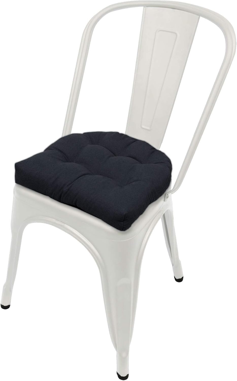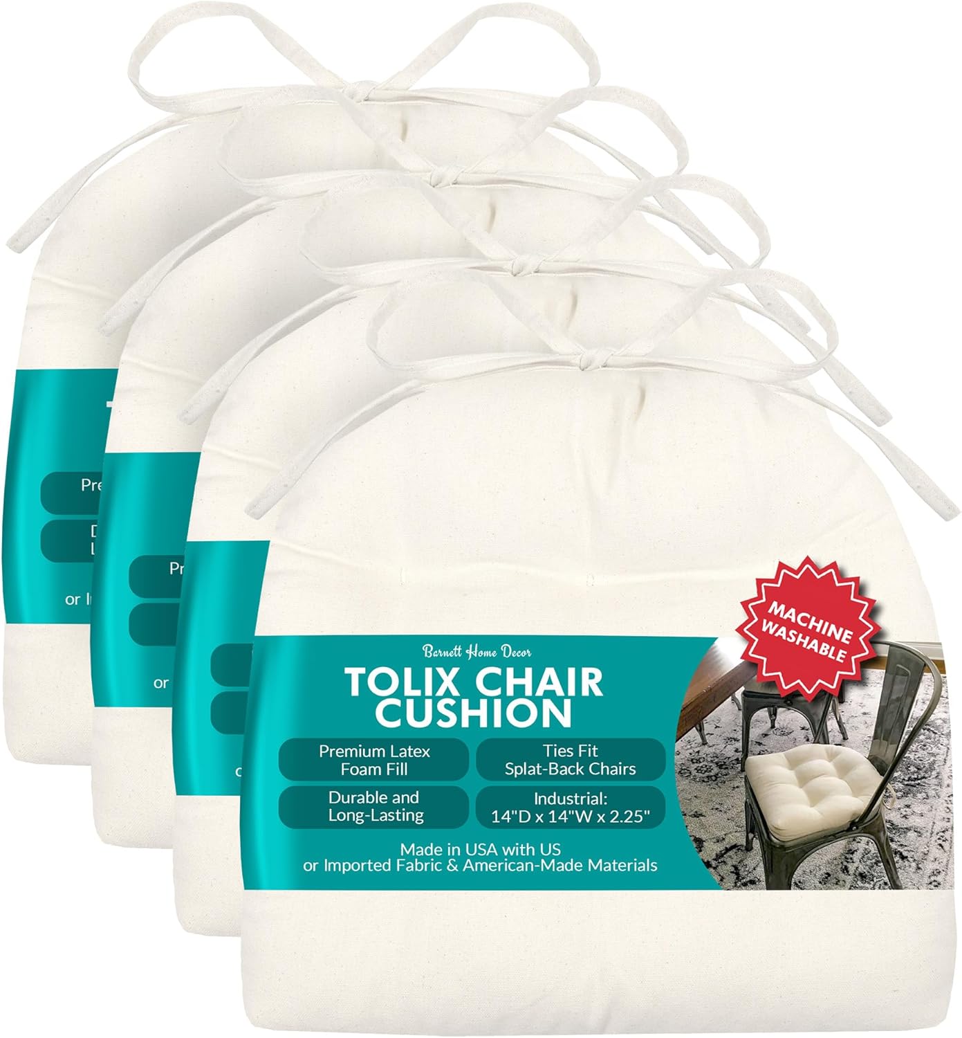 Barnett Home Decor Tolix chair cushions are sized 14 x 14 to fit industrial-style metal dining chairs, with longer center-positioned ties for splat-back chairs. Made in the USA with American-made fabric and materials, these cushions combine classic style with everyday comfort. Filled with resilient latex foam that retains shape and resists flattening over time. The ticking stripe fabric is breathable and soft, with lock-stitched seams to prevent unraveling and triple-stitched ties for secure placement. Reversible to the same fabric on both sides and machine washable for easy care. Set includes two seat cushions with ties (chairs not included). Size: 14 D x 14 W x 2 H. All dimensions are approximate. Made by a women-led, family-owned business in Macon, Georgia.