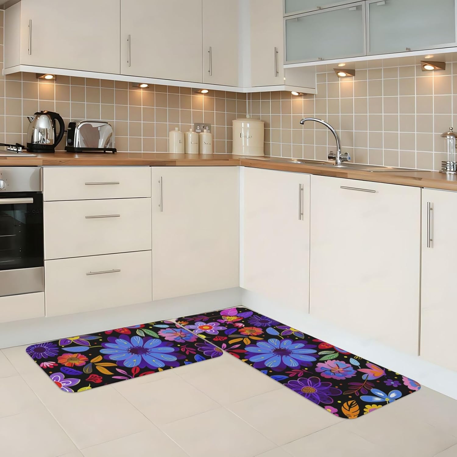 Material: Polyester.Dimensions: 17x29.5inch+17x47.2 inch/43x75cm+43 x 120 cm. Thickness: 5-6MM.Packaging: 2 PCS x Kitchen Floor Mat.Strong Water Absorption --- Keeping Your Floor Dry and TidyThe surface of the Kitchen rug can absorb moisture or other spills, effectively resisting stains and keeping your floor clean and dry.Anti Slip Safety DesignThe anti slip rubber backing design of the floor mat ensures that it is firmly fixed on ceramic tiles, wood, or reinforced wood floors. Whether you are washing dishes or cooking, textured surfaces can provide a stable foothold and improve safety.Anti Fatigue and Comfortable Standing Mat --- Helps You Relieve Foot PressureComfortable and soft kitchen rugs with a quick rebound surface and Low-Profile design provides sufficient support for your feet and knees during prolonged standing, effectively relieving fatigueSuitable for Indoor and Outdoor AreasYou can use this floor mat as a kitchen rug, bathroom rug, bath mats, doormat, laundry room rug, office rug, farmhouse rug, standing ma, bedroom carpet. Washable rugs is also an ideal housewarming gift choice.Kitchen Decoration AccessoriesThe modern and elegant kitchen rugs non slip washable pattern is exquisite and cute, easily integrating into different styles of indoor homes, adding new colors to your kitchen.Easy to Clean and Maintain:The washable kitchen sink mat can be cleaned with a vacuum cleaner or wiped with a damp cloth. Long term transportation may cause creases and odors in kitchen mats. You can place the foot pad flat in a well ventilated area for a period of time.