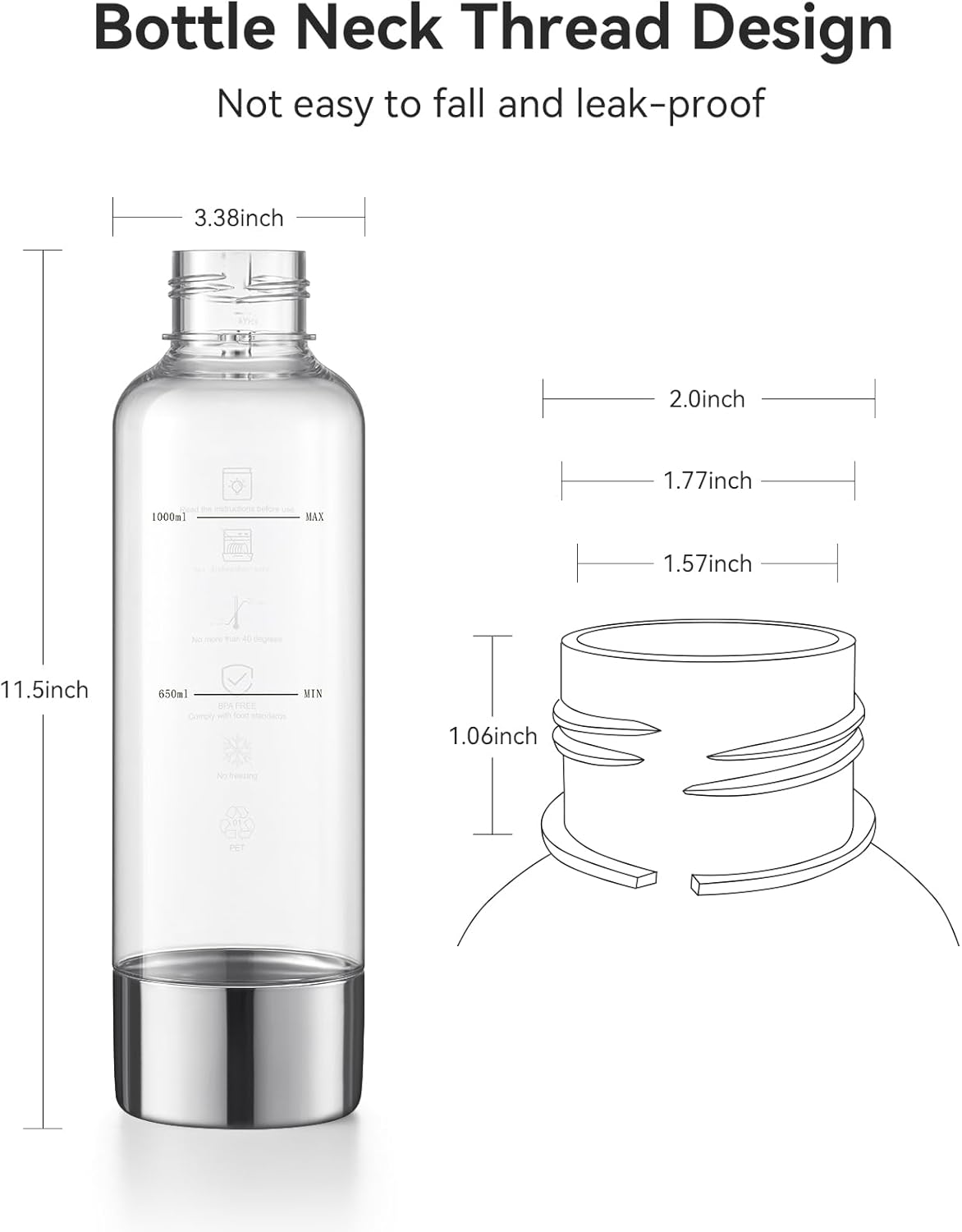 Soda Streaming Machine, Carbonates Any Drink, Soda Maker Compatible with 60L CO2 Carbonator (NOT Included) - Stainless SteelFeatures:đ¸SPARKLE AT THE PARTY: Freely mix your own signature carbonated drinks, unleash your creativity and become the center of attention at your next get-together. Unlike other soda fountain machines, we can sparkle anything from iced tea to custom cocktails with a simple pull of a lever. Enjoy it on a busy morning or spontaneous gatherings with friends.đ¸ANTI-CLOGGING TECHNOLOGY: MOKKOM soda water maker is equipped with a exclusive detachable nozzle and spray pipe, which prevent clogging and are easy to clean. Easily carbonate any juice drink without any burden.đ¸PRECISION ANTI-FREEZE NOZZLE: Our innovatively designed 316 stainless steel precision nozzle has an aperture as small as 0.3 mm, which can produce a large number of fine and powerful bubbles. Carbonate your cold water, the nozzle will not freeze and the nozzle pore will not be blocked.1L Reusable Sparkling Water Bottles, BPA Free PET Carbonating Bottles, Replacement Bottle Compatible Sparkling Water MakerFeatures:ăIdeal for Any OccasionăOur large-capacity refillable water bottles are suitable for various occasions such as home, kitchen, travel, picnics, camping, fitness, hiking, running, cycling, etc, it is also perfect for use as regular water bottle. Keep a few MOKKOM bottles in your fridge, so you can enjoy fresh, chilled soda anytime.ăExcellent SealingăThis plastic water bottle is only compatible with MOKKOM sparkling water machines. It uses a threaded neck thread design to make it difficult to fall off and provide an airtight seal to prevent leaks, keeping your sparkling beverages stay fresh and fizzy longer. It can bring you the best carbonation experience anytime, anywhere.