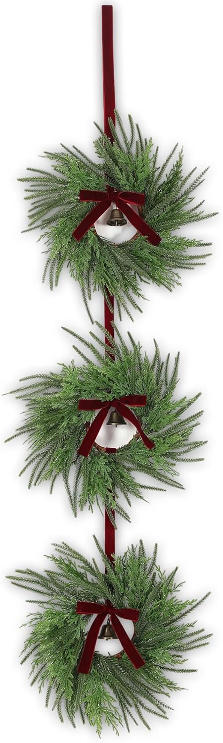 Features: Please note that our Christmas wreath hanging strap set comes pre assembled, and the three wreaths cannot be disassembled. You can also give this creative holiday wreath decoration as a gift to your friends to strengthen your bond. Specifications: Material: main velvet, plastic, leaves Color: main red, green Size: measures 11 x 61 inches/ 28 x 155 cm Package includes: 2 x Christmas wreath hanging strap Notes: Manual measurement, please allow slight errors on size. The color may exist a slight difference due to different screen displays Winding risk may exist, please keep our product away from children