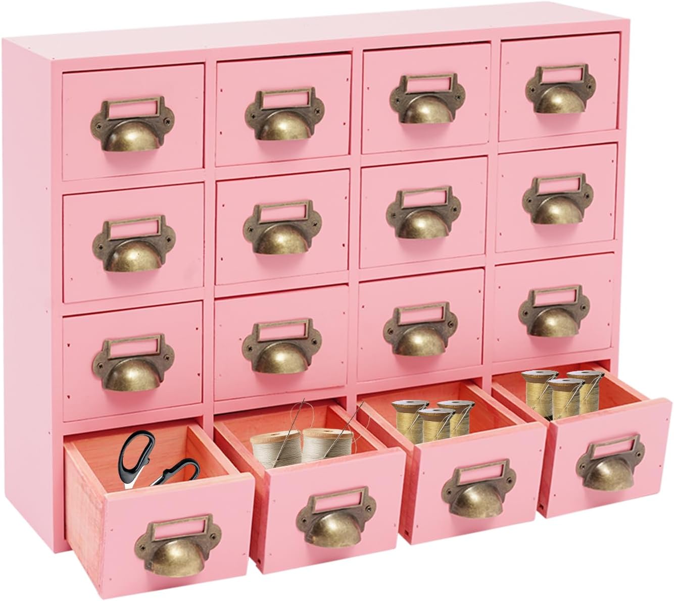 SpecificationsMaterial: Pine Wood, Plywood, Zinc AlloyProcess: Spray Paint, AgingShape: RectangleStyle: VintageAssembly Required: NoMounting Type: Tabletop MountEach Cabinet Load Capacity: 10kg/22.05lbsNumber of Cabinets: 4Number of Drawers: 64Each 16-drawer Cabinet Size(L*H): 50*35cm/19.69*13.78inOverall Product Size: 100*10*70cm/39.37*3.94*27.56inPackage Size: 61.5*40*56.5cm/24.21*15.75*22.24inGross Weight: 22kg/48.5lbsNet Weight: 20kg/44.09lbsPackage Included4*16-drawer CabinetsNotes1. Please check the size carefully before ordering.2. Please note that the package does not contain any other items except the cabinets.3. Please allow the slight color difference caused by the shooting light and the 1-3 cm error due to manual measurement, and make sure you do not mind before ordering.