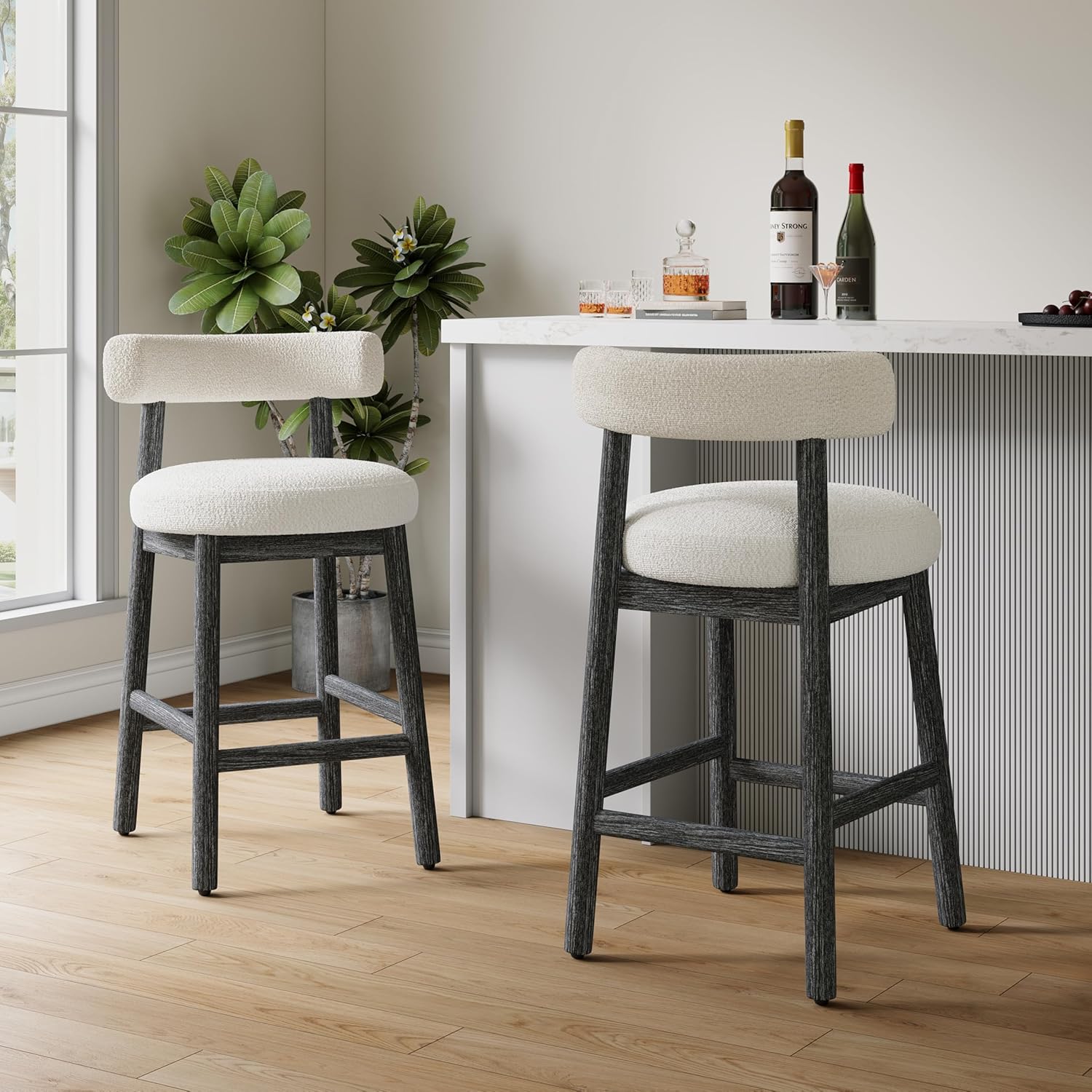 Upgrade your space with this set of 2 modern counter height bar stools, blending minimalist design with functional comfort. The curved backrest silhouette and round, boucle-upholstered seats bring contemporary elegance to any kitchen or dining area. Crafted with a sturdy rubberwood frame and footrest, each stool supports up to 300 lbs. With a 26.77" seat height, they pair perfectly with standard kitchen counters, home bars, or elevated dining setups
