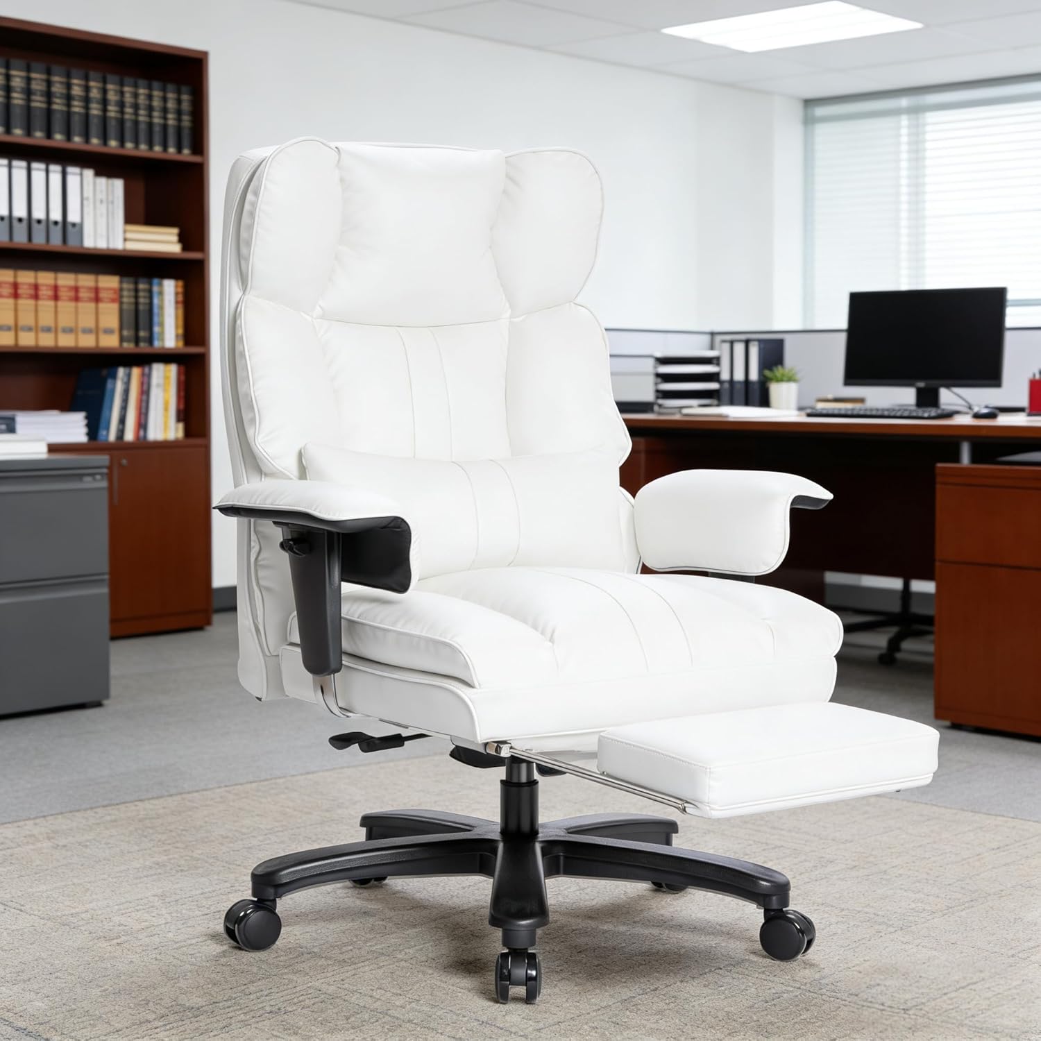 ADJUSTABLE OFFICE CHAIR — ESTRUCO executive office chair offers a 360° swivel, allowing you to move freely. It features a height adjustable mechanism, back angle, and tilt/swivel system, enabling you to swing the chair back and forth at any angle up to 135°. The swivel chair with Leg Rest comes with a tilt tension knob that allows you to customize the tension to your personal preference. Experience the comfort and flexibility with this reclining office chair, perfect for your home office desk chairsCOMFORTABLE OFFICE CHAIR — ESTRUCO ergonomic office chair equip a dual-layered sponge seat cushion. The big office chair backrest and independent lumbar support gently wrap around your body ,support your lower back, thoughtfully designed for the big and tall office chair to keep you comfortable during long hours of working, studying, or gaming. The leather office chair provides unparalleled comfort. Moreover, this executive chair with leg rest adds an extra dimension of relaxation to your workspace.HEAVY-DUTY LEATHER OFFICE CHAIR— ESTRUCO big and tall office chair, featuring a heavy-duty metal base, is designed to accommodate individuals weighing up to 400 lbs. The comfy office chair boasts a big high back chair design and is upholstered in leather, providing both style and comfort. The executive office chair is equipped with an oversized seat cushion (seat size: 21.3"D X 23.2"W X 4.7" Thick), ensuring ample space and support.CERTIFIED QUALITY WIDE OFFICE CHAIR— Every part of the task chair has been carefully selected and crafted, a necessary investment to help customers worry less. the leather material on the office chair gives you a good touch. The office chair with leg rest is not only comfortable but also stylish.Smooth wheels, SGS certified Class 4 gas cylinder, strong supporting metal base, all tested over 100,000 times and certified for safety and quality. BIFIMA certified, the big and tall office chair is reliable and robu