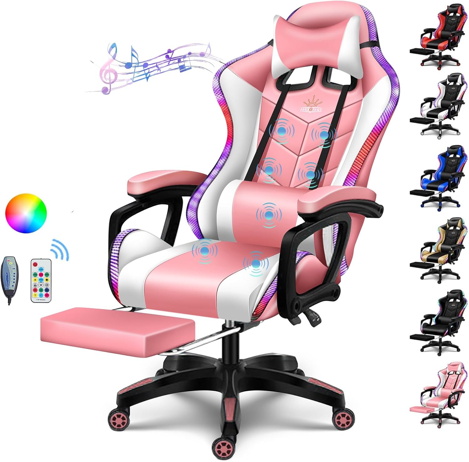 ✅YOU WORK ALL DAY OR PLAY COMPUTER GAMES FOR A LONG TIME. ARE YOU TIRED?✅Are you still looking for a great gaming chair or office chair?This gaming chair is equipped with LED racing lights to add cooler effects and designed with Bluetooth speakers for giving a 360° Immersive sound experience. The perfect combination of game chair and massage chair, built-in seven professional massage function modules. Handle control, easily switch modes, adjust speed and massage position.It is not only a professional gaming chair, but also can be used as an office chair, home study chairs. Give you a comfortable rest experience!★★★The newly upgraded gaming chair brings two new chair colors!!★★★MAIN FEATURES OF THE PRODUCT:1. The perfect fusion of gaming chair and massage chair.2.3D stereo surround Bluetooth dual audio.3. The color-changing effect design of LED light bar.4. Slide rail handrail design, 3 fixed points, stronger supporting force.5. High-quality leather wrap, built-in environmentally friendly, comfortable, and breathable latex sponge.6. Thickened chassis, high-quality forged steel chassis, super load-carrying capacity.7. Equipped with retractable footrest, adjustable headrest and lumbar support, fully meet your actual needs.Specification:Weight: 17kgTolerate: 150kgMaterial: PU leather/metalColor: White, red, black, pink, blue,goldPacking size: 38*56*82CMArmrest: Three-point linkage armrestFoot material: Nylon feetChair wheel: PU wheelFunction: Lifting, ergonomics, swivel, reclinerApplicable places: gaming room, home, studio, computer, live room, bedroomPACKING LIST:1*Game chair1*Handle1*installation manual