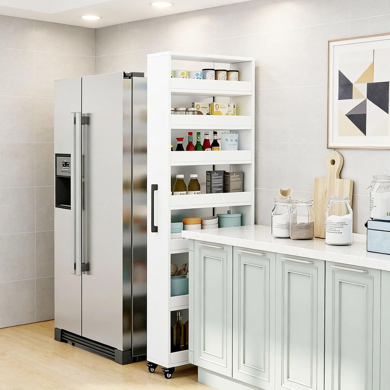 Tired of wasted space and kitchen clutter? Meet our Kitchen Narrow Gap Storage Cabinet — the sleek, space-saving storage solution designed for modern homes. Seamlessly fitting into those narrow gaps, this versatile storage cart transforms unused areas into highly organized storage zones. Functioning as a perfect storage shelf for next to fridge or a compact rolling spice rack with handle, it maximizes efficiency. Its design also serves as an ideal 7-tier slim rolling storage cart and a sturdy wood spice rack on wheels next to fridge, offering versatile organization. Perfect for keeping your kitchen tidy and efficientProduct Details:Product Name: Kitchen Narrow Gap Storage CabinetStyle: Modern MinimalistMaterial: Solid Wood Particle Board (Paint-Free)Colors: White, Dark Gray, Light Walnut, Teak, Black WalnutPackage Includes: 1 x Storage Cabinet (Easy assembly required)Available Sizes (Width × Depth × Height):W5.9" × D17.7" × H72.4"W5.9" × D21.7" × H72.4"W7.9" × D17.7" × H72.4"W7.9" × D21.7" × H72.4"W9.8" × D17.7" × H72.4"W9.8" × D21.7" × H72.4"Friendly Reminder:- Dimensions are manually measured; a slight variance of 1–3 cm may occur- Colors may appear slightly different on various monitors; the actual product color prevails- Questions? Our customer support is here to help — feel free to reach out anytime