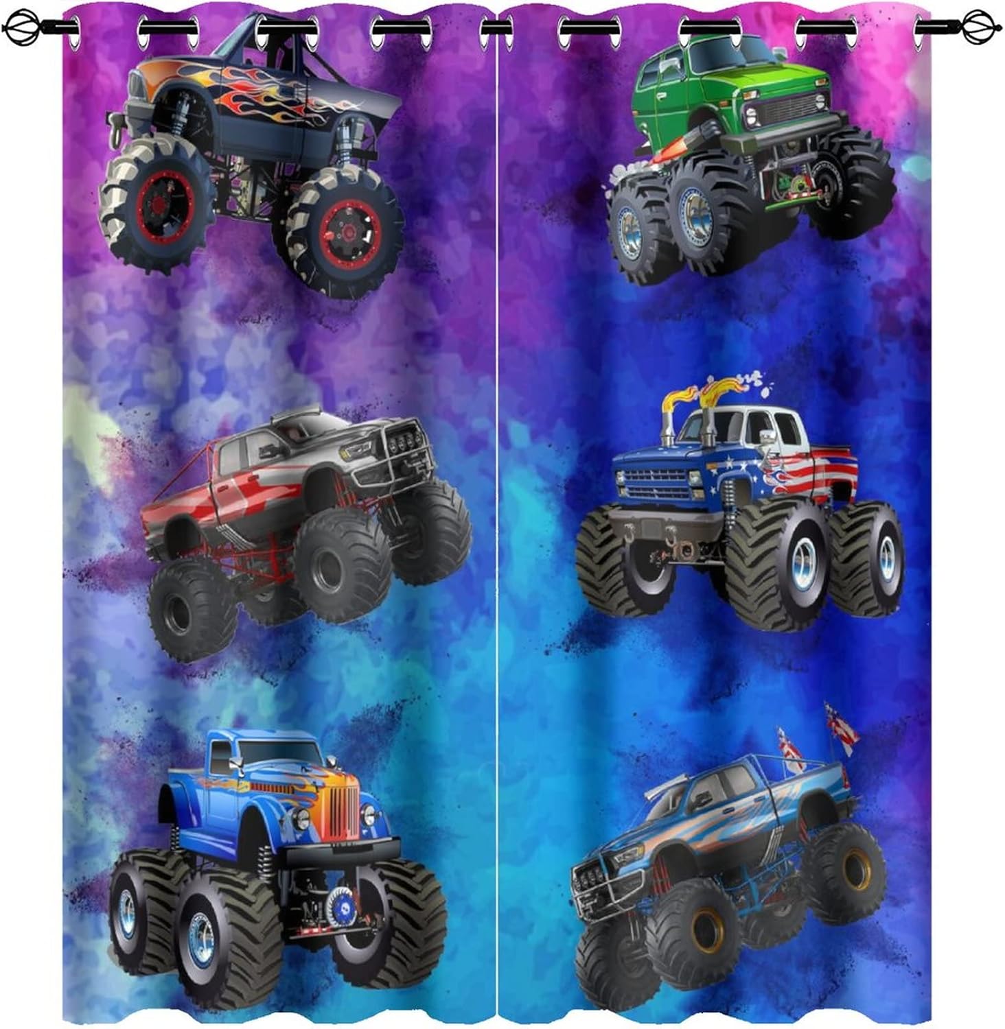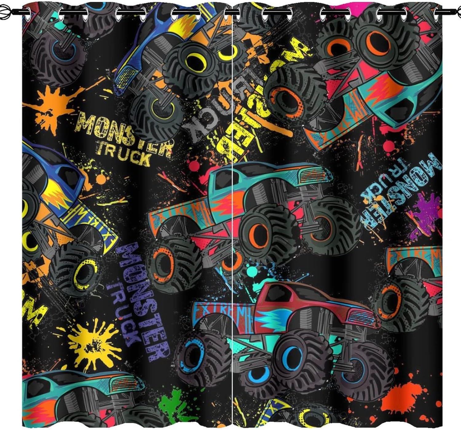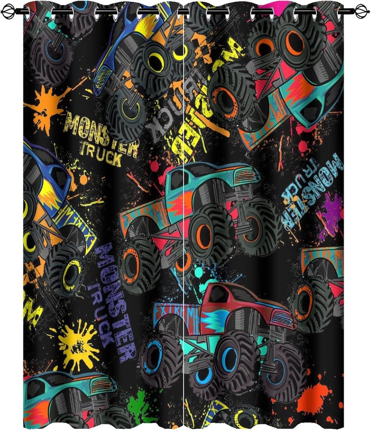 This Cool Cartoon Monster Truck Curtains can block out 85%-99% sunlight and UV ray ( Darker colors work better), perfect for late sleepers and afternoon naps. Our energy saving curtains insulate against summer heat and winter chill to balance your room temperature, reduce outside noise .Kazynee Custom Design Shop:Our curtains Immerse your home in splashes of color.The 3d print curtains give off a realistic tint in the whole room and turns the room into a magical colorful fairy-scape.Premium Material:Adopt high-quality 100% polyester fabric.Three-layer woven fabric, high-precision black silk shading partition,density of the middle black silk layer is double that of ordinary fabrics, greatly improve the shading effect.HD Printing Technology:High resolution pictures bring a perfect visual experience to your life.Industry-leading HD printing technology, No strange odor. Toxic free and safe.Easy Cleaning:This blackout curtains machine washable, gently cycle, no bleach, tumble dry low, and iron at low temperature settings.Kindly Remind:- Don't use sharp things scratching curtains.- For proper fullness panels should measure 1.5-2 times the width of your window.- 24 Hours customer support.- As different computers display colors differently, the color of the actual item may vary slightly from the above images.