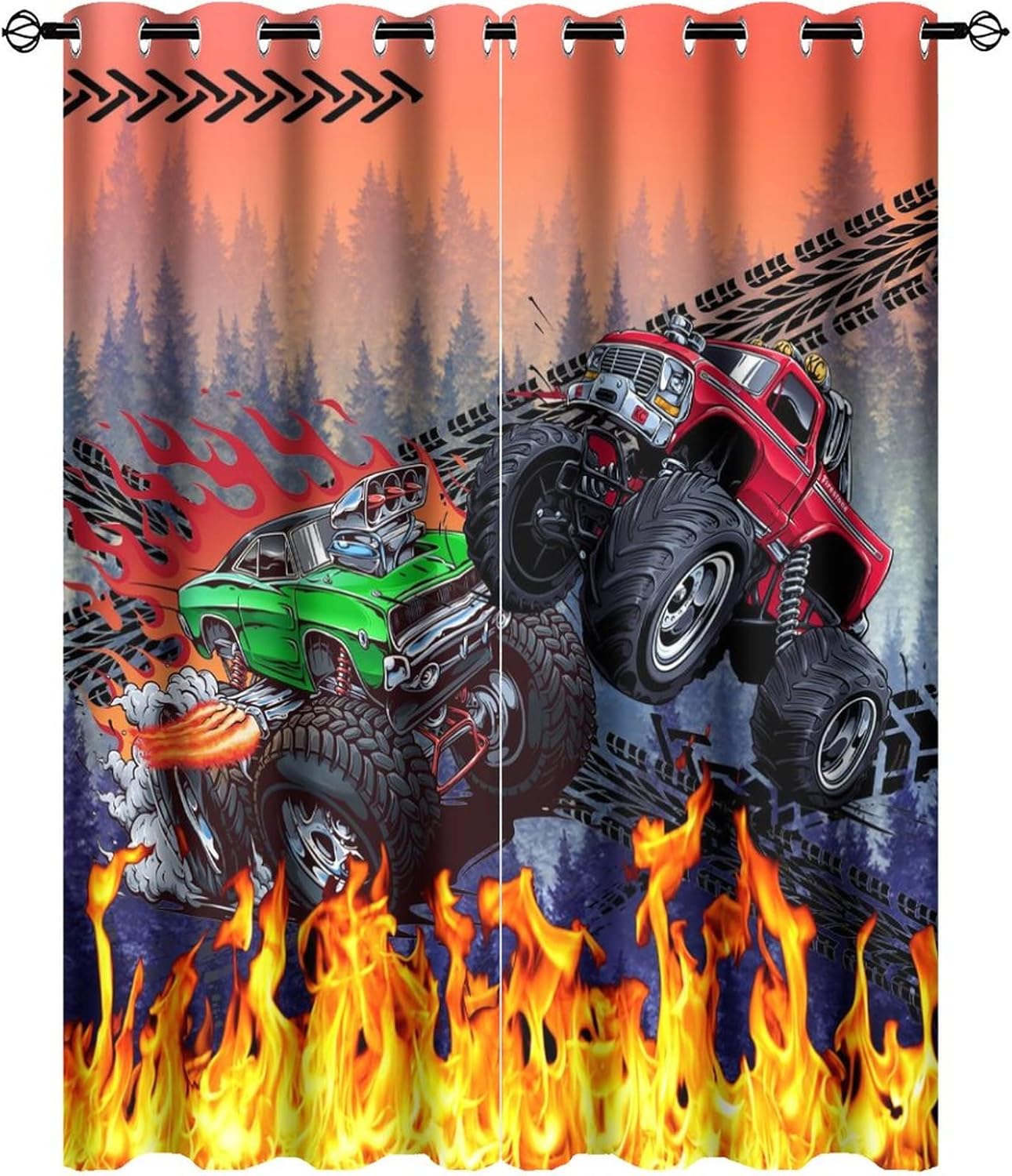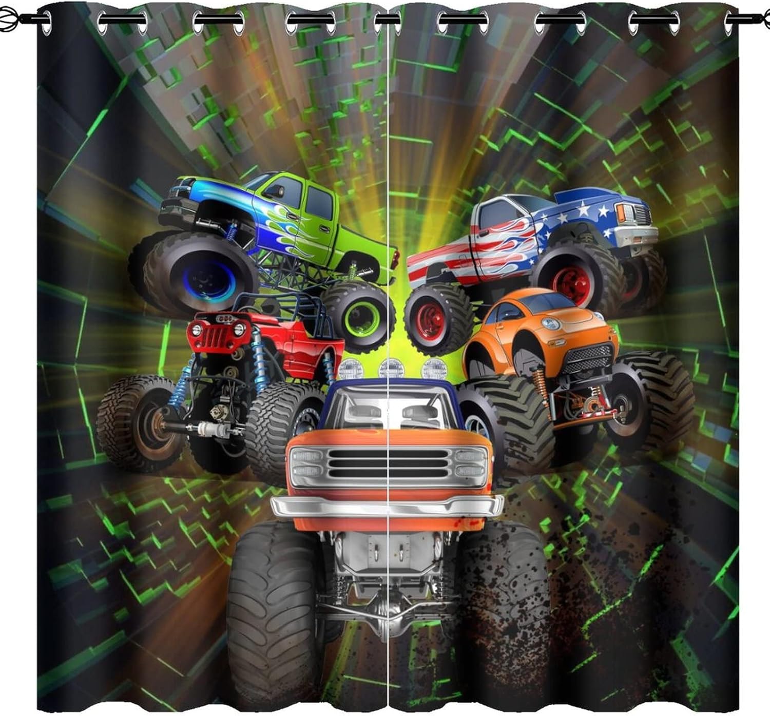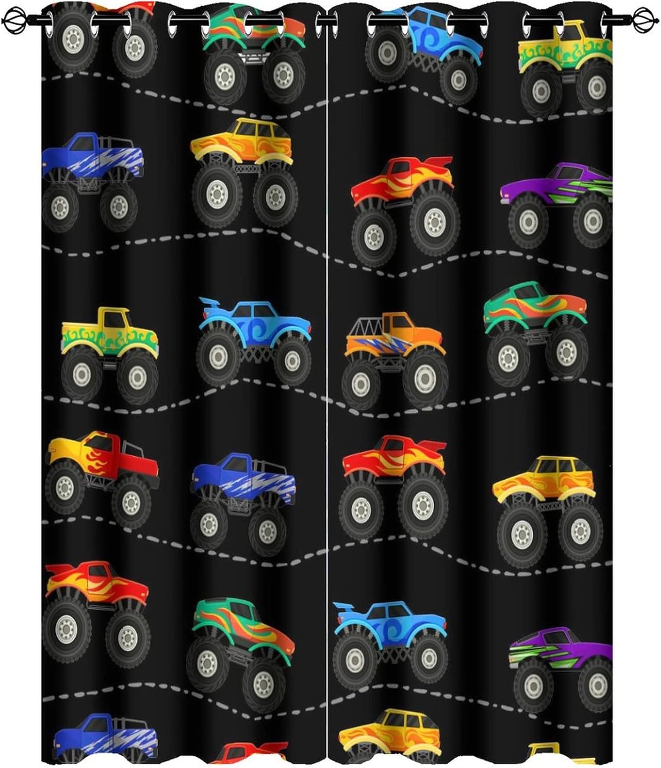 This Cool Cartoon Monster Truck Curtains can block out 85%-99% sunlight and UV ray ( Darker colors work better), perfect for late sleepers and afternoon naps. Our energy saving curtains insulate against summer heat and winter chill to balance your room temperature, reduce outside noise .Kazynee Custom Design Shop:Our curtains Immerse your home in splashes of color.The 3d print curtains give off a realistic tint in the whole room and turns the room into a magical colorful fairy-scape.Premium Material:Adopt high-quality 100% polyester fabric.Three-layer woven fabric, high-precision black silk shading partition,density of the middle black silk layer is double that of ordinary fabrics, greatly improve the shading effect.HD Printing Technology:High resolution pictures bring a perfect visual experience to your life.Industry-leading HD printing technology, No strange odor. Toxic free and safe.Easy Cleaning:This blackout curtains machine washable, gently cycle, no bleach, tumble dry low, and iron at low temperature settings.Kindly Remind:- Don't use sharp things scratching curtains.- For proper fullness panels should measure 1.5-2 times the width of your window.- 24 Hours customer support.- As different computers display colors differently, the color of the actual item may vary slightly from the above images.