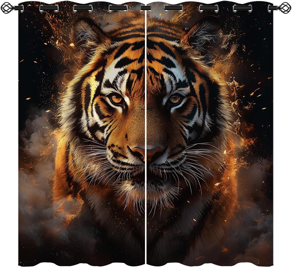 These print curtains are perfect for Living room, bedroom, kids room, kitchen, yard, patio, parlor, sliding door with Ferocious Tiger,Kids 3D Tiger Fantasy Wild Animal pattern.- Unique design:· Save energy costs by insulating against heat and cold.· Reduce noises from busy streets and high-traffic areas.· Protect furniture from sun damage and fading.· Provides complete privacy when needed· Perfect for any bedroom, office kids room and living room.- Package Included:· Blackout window curtains 2 Pcs set ( two panels).- Material:· Our Blackout Curtain Liners are crafted from a durable soft and thick triple weaved blackout fabric which can block out sunlight and UV rays. The darker color of the fabric, the more light it can block.- Easy Care Instructions:· Machine washable in cold water· Do not bleach.· tumble dry on low· low temperature ironing- Notes:· For your curtains to be more perfect, please choose a size 5-10 Inch larger than the actual window width.· here may be slight differences in colors on different displays. If you have any questions about the product, please feel free to contact us.
