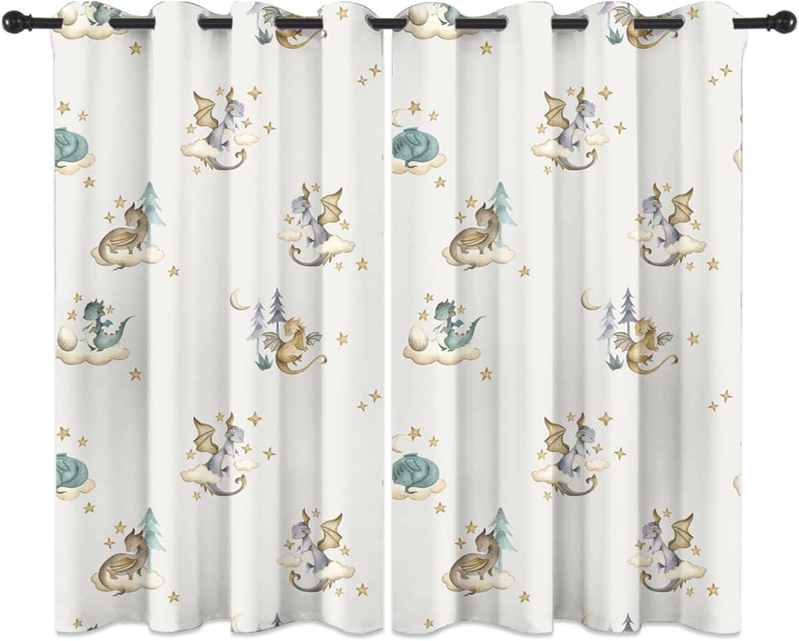 Watercolor Cute Baby Dragon Patterned Blackout CurtainsThis Watercolor Cute Baby Dragon Curtains liven up your indoor or outdoor spaces with a sense of airiness and beauty.Workmanship & Design:Each curtain is machine-made and neatly sewn with no loose threads. Soft,high-quality fabrics ensure long-lasting durability.Beautiful patterns,clever colour matching and advanced printing and dyeing processes for vibrant,fade-free colours.This Fantasy Cartoon Mid Century Woodland Dragon Curtains is suitable for: living rooms,bedrooms,boys' rooms,girls' rooms,nurseries,dining rooms,offices,dormitories,window sills,etc.Care instructions.Machine wash in cold water or hand wash,do not bleach,iron at low temperature.Customer service.