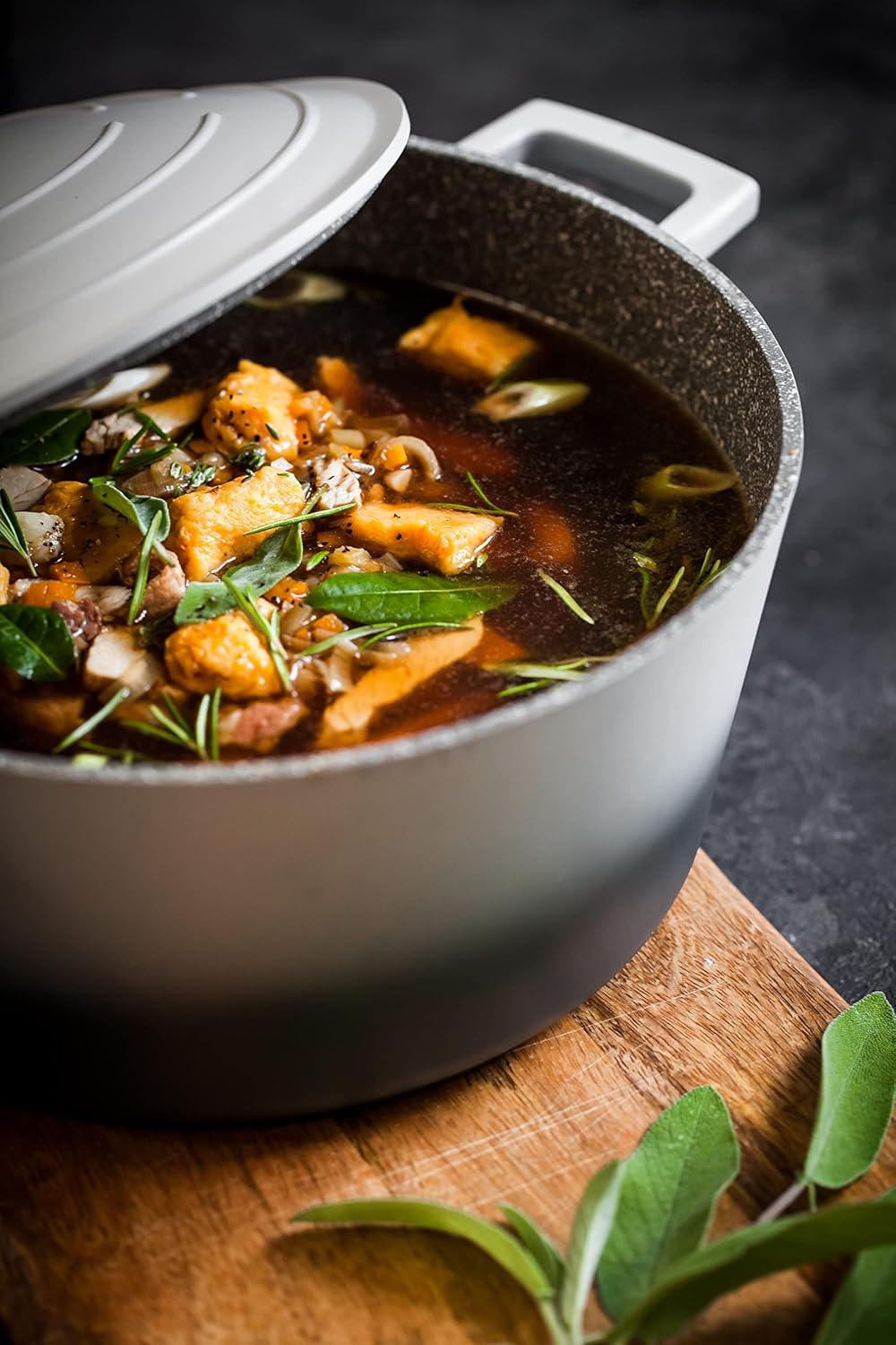 Revolutionise the way you cook.It's not often you get to enjoy the best of all worlds. But with MasterClass’s cast aluminium casserole dishes, you can.Thanks to its cast aluminium construction, this sturdy dish is a strong heat conductor. This means you get all the benefits of cast iron cookware, but in a lightweight, easy to handle form.It's finished with a double scratch-proof, non stick layer. This all adds up to the perfect recipe for a long-term kitchen companion - an extra-tough stew pot that cooks one-pot meals evenly and thoroughly.You can use this large casserole dish with lid for oven or stovetop cooking (it’s induction safe). It’s great for braising meats, slow-cooking stews, making curries and more.