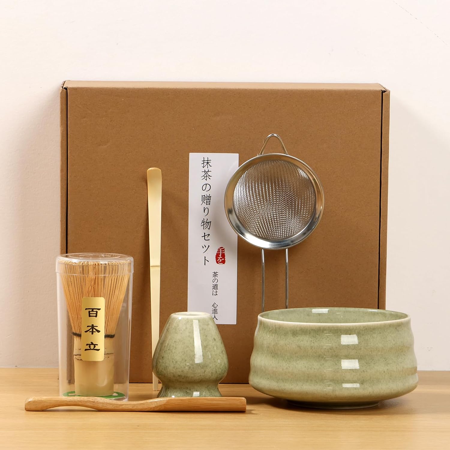 Parts List:1 × Matcha Whisk1 × Matcha Whisk Storage Holder1 × Tea Spoon1 × Tea Spatula Spoon1 × Matcha Powder Sifter1 × Ceramic Bowl1 × Ceramic Whisk HolderDescription:If you are also interested in Japanese matcha culture, try this matcha making kit. It contains all the tea cooking tools so that you can make matcha drinks in the traditional way.Key Feature:Practical Tea Making Tools: This set contains complete matcha making tools, making it easy for you to experience the whole process of making matcha.2 Colors to Choose from: This matcha whisk set comes in 2 colors for you to choose from, beige and light green. You can choose according to your preference.Specification:Product Name: Matcha Whisk SetColor (Optional): Beige, Light GreenMaterial:Matcha Whisk / Tea Scoop / Tea Spatula Spoon: Bamboo WoodMatcha Bowl / Matcha Whisk Holder: CeramicMatcha Powder Sifter: Stainless SteelMatcha Whisk Storage Holder: PlasticSize:Matcha Whisk: 6 x 6 x 10 cm / 2.36 x 2.36 x 3.9 inchesTea Scoop: Length: 18 cm / 7 inchesTea Spatula Spoon: Length: 17 cm / 6.69 inchesCeramic Bowl: 12 x 12 x 7.5 cm / 4.7 x 4.7 x 2.95 inches; Capacity: 550mlCeramic Whisk Holder: 6 x 6 x 7 cm / 2.36 x 2.36 x 2.76 inchesMatcha Powder Sifter: Length: 21.5 cm / 8.46 inches, Width: 8 cm / 3.15 inchesNote:1.There may be slight differences between the picture and the actual color of the commodity. We will try our best to show you the exact color.2.Please allow slight dimension differences due to manual measurement.