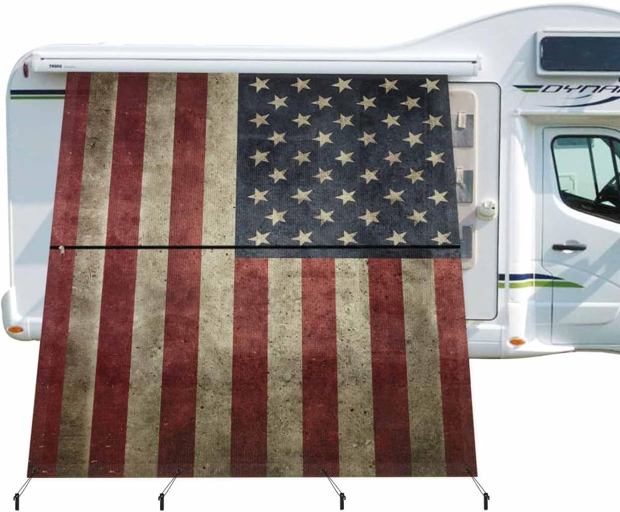 Premium High-Density Polyester Mesh Privacy Motorhome Awning Sun Shade Screen, An Essential Addition for Camping Trips.How to Choose Your Perfect Fitted SizeMethod A: Please measure your existing awning from center of arm to center of arm. This 9'x13'3" shade has a finished fabric measurement of 9' drop by 13'3" length and fit for 14' motorhome awning.Method B: Measure your awning fabric length and choose same length of our motorhome shade. For example you measure your awning fabric as 14', please simply choose this 9'x13'3" shade.Why Choose Our Motorhome Awning Side Shade1. These motorhome sun shade screen help block out those crazy sun rays that try to beat you down while camping and also give you privacy when camping right next to others.2. Motorhome awning sun shade side screen can be easily fixed by sliding into the motorhome awning rail with coming poly-cord. You just leave the upper section on to roll in and out with the patio awning and zip on the lower section when needed.3. Bungees fastest fix compared to normal rope tie down. When the winds whip up and storms come in, you just unzip it and roll in the awning and stow the bottom section with the bungees, it's that easy.4. High-density material mesh has better durability and will retain its color after long-term use.The bottom of the motorhome awning screen is equipped with 8 thick grommets that no crack by strong pulling and do no rust in extreme weather.5. The motorhome awning side shade screen helps avoid your motorhome awning from being blown down and damaged by the wind.6. This outdoor awning sunshade screen is designed to fit a wide range of popular awning systems, ensuring versatility and ease of use.Package Include8 x Plastic Stakes8 x Bungee Cords1 x Awning Shade Screen 9' x 13'3" (9 Feet Drop, 13.3 Feet Length)