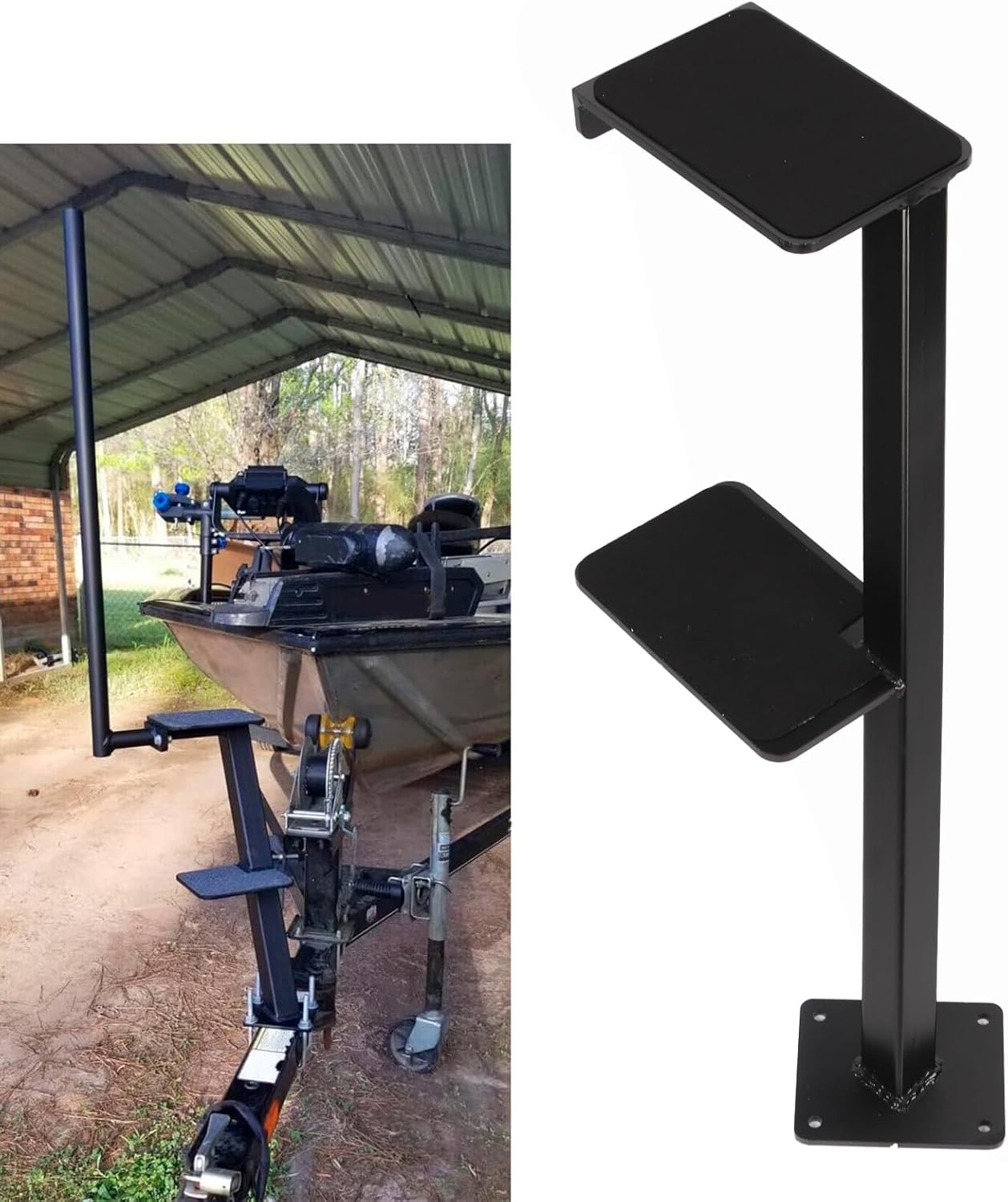 Item Type: Boat Trailer StepMaterial: Stainless Steel PaintApplication: for Most Bass Boats and TrailersSize: Each Step: Approx. 20.32cm / 8in wide and 15.24cm / 6in deep.Total height when installed from the top of the tongue to the top of the top step: 53.34cm / 21in.Package List:2 x Trailer Universal Step Accessories2 x U Shaped Clips2 x Bolts6 x Nuts4 x WashersNote:1. Make sure the distance from the top of the trailer coupler to the bow is 29 inches or less (measured vertically).2. Ensure the tongue width is 3.5 inches or less (most bass boat trailer tongues are 3 inches or 3.5 inches).3. These steps are not suitable for large vessels such as deep V boats.
