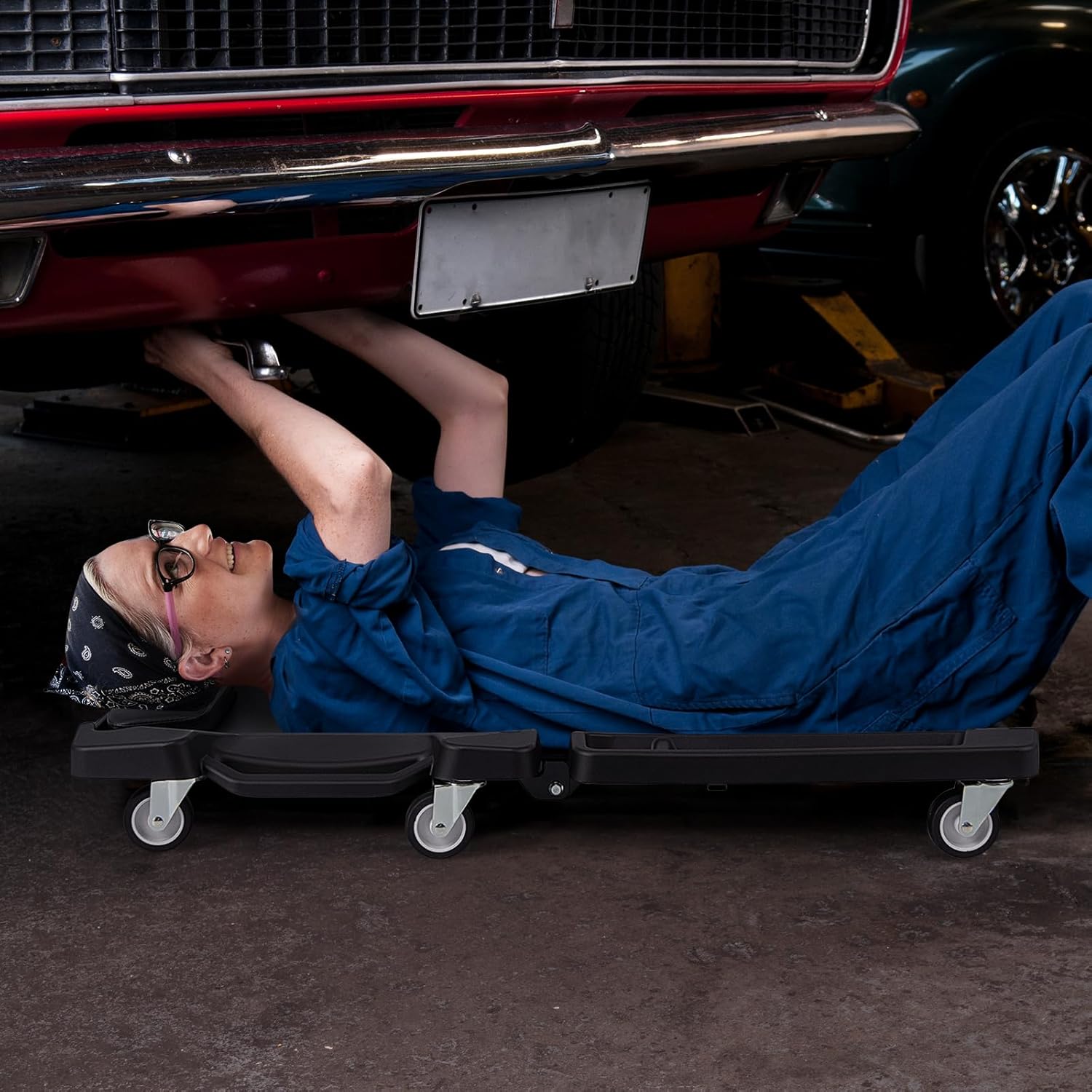 Enhance your garage work with this auto creeper.This car creeper for mechanics features a foldable design that allows for easy storage and portability, making it perfect for workshops with limited space. Equipped with 6 universal casters, it provides smooth 360-degree mobility, enabling users to effortlessly move around and access tight spots. In addition, the rolling creeper is built with a strong 350 lbs loading capacity and measures 43” in length by 22” in width, offering ample support and space during repairs. The low-profile creeper’s ergonomic padded headrest and contoured lying area ensure maximum comfort, reducing fatigue during prolonged tasks. Both sides include handy tool trays, with smaller trays featuring magnetic surfaces to keep essential screws and parts securely within reach.Features:Ensure strong stability and high reliability with sturdy metal structureThe 6 universal casters with low noise glide easily across the floorEnsure that your head and neck are comfortably supported with padded headrestThe contoured lying area conforms to your body for optimal supportEasily store and transport it without taking up much space with foldable designBuilt-in handle for great convenienceBecause it has a low profile, the creeper fits under tight car spacesProvide you with handy storage and keep tools within reach with side tool traysNo need to assembleSpecifications:Color: BlackMaterial: PP, Metal, PVC Leather, EPE FoamUnfolded Dimensions: 43” x 22” x 5.5”Folded Dimensions: 23” x 22” x 7”Net Weight: 20 lbsWeight Capacity: 350 lbsPackage Includes:1 x Foldable Mechanic Creeper1 x InstructionWhy You Choose Our Foldable Mechanic Creeper?✔Easily fold for compact storage and portability✔Rolls smoothly with 6 universal casters for better mobility
