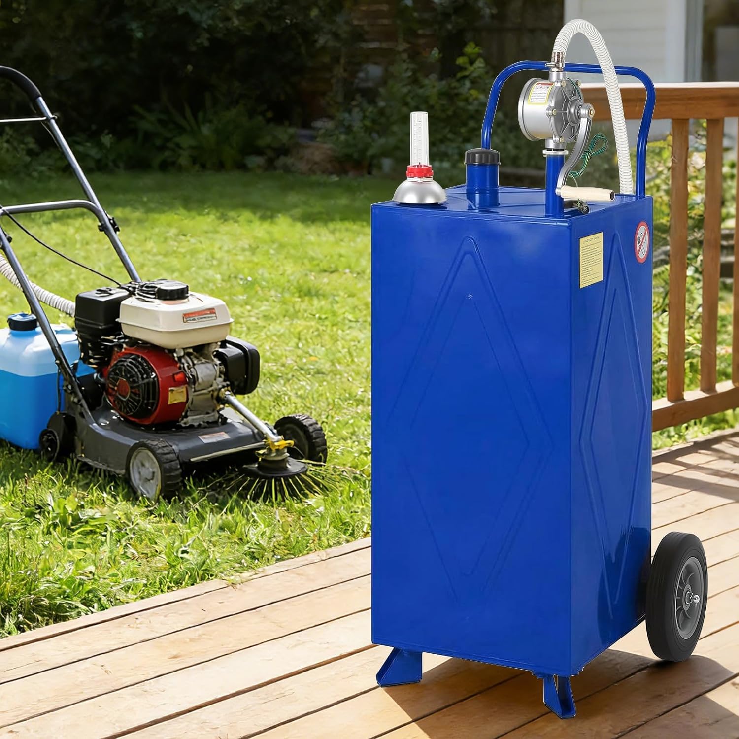 30 Gallon Fuel Gas Caddy Storage Tank, Rolling Portable Gas Caddy Fuel Transfer Tank w/ Wheels, Manual Crank Pump w/ Return Function, Fuel Hose, Vented Cap & Level Gauge, Grounding Clamp—Gasoline/Diesel for ATV, Mower, Tractor, Car, BoatDesigned for quick refuels with a 30 gallon Fuel Gas Caddy Storage Tank with wheels and hose and a Portable Gas Caddy for gasoline transfer at home or farm.Cleaner operation using a Fuel Gas Caddy Storage Tank with manual crank pump and return line function and a Portable Gas Caddy that clears fuel from hose back to tank.Easier monitoring with a Fuel Gas Caddy Storage Tank with vented cap and fuel level gauge and a Portable Gas Caddy with easy-read level indicator for filling.More controlled handling with a Fuel Gas Caddy Storage Tank with grounding clamp for static control and a Portable Gas Caddy for controlled diesel dispensing to equipment.Less lifting required with a Fuel Gas Caddy Storage Tank on heavy-duty wheels for transport and a Portable Gas Caddy for rolling fuel to vehicles and tools.Built for multiple applications with a Fuel Gas Caddy Storage Tank for ATV mower tractor boat fueling and a Portable Gas Caddy for small engine and fleet refueling.